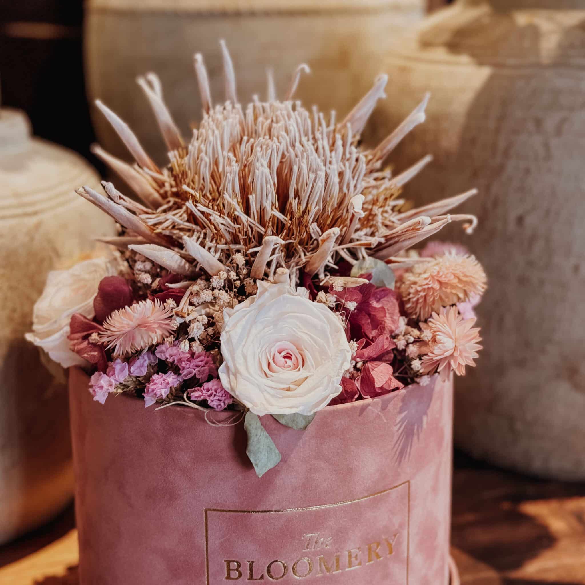 Samtbox in rosa, mit getrockneter Königs Protea, stabilisierten Rosen und Trockenblumen in rosa, pink und beige Ø 20 cm