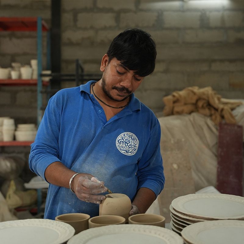 Unsere erste Geschirrkollektion entstand in Zusammenarbeit mit dem Keramikproduzenten Sudipta Saha und metta. Der talentierte Jungunternehmer Sudipta Saha aus einem Dorf in der Nähe zu Bangladesch verfolgte leidenschaftlich sein Ziel, hochwertige und nachhaltige Keramikprodukte herzustellen. Nach seinem Master-Abschluss in Keramik und harter Arbeit in seinem Heimatelier, kollaboriert er nun mit Herrn Lakhani in Kolkata. Diese Zusammenarbeit bietet Zugang zu Maschinen, Platz und Arbeitskräften für die gesamte Keramikproduktion, wodurch der ökologische Fussabdruck erheblich reduziert wird. Die Materialien werden von einheimischen Handwerkenden hergestellt, was nachhaltige Lebensgrundlagen schafft. Eine Mitarbeiterin wird derzeit geschult, weitere Frauen sollen folgen. Die Zusammenarbeit mit Organisationen wie Metta Muse und Changemaker soll die Ausbildung lokaler Frauen zu Keramikerinnen fördern und ihnen Respekt, Würde und nachhaltigen Lebensunterhalt bieten. Sudiptas Engagement und die Stärkung der lokalen Gemeinschaft sind der Schlüssel zum Aufbau eines ganzheitlichen und inklusiven Ökosystems in einer Region, die wenig Bekanntheit für Keramik hat.