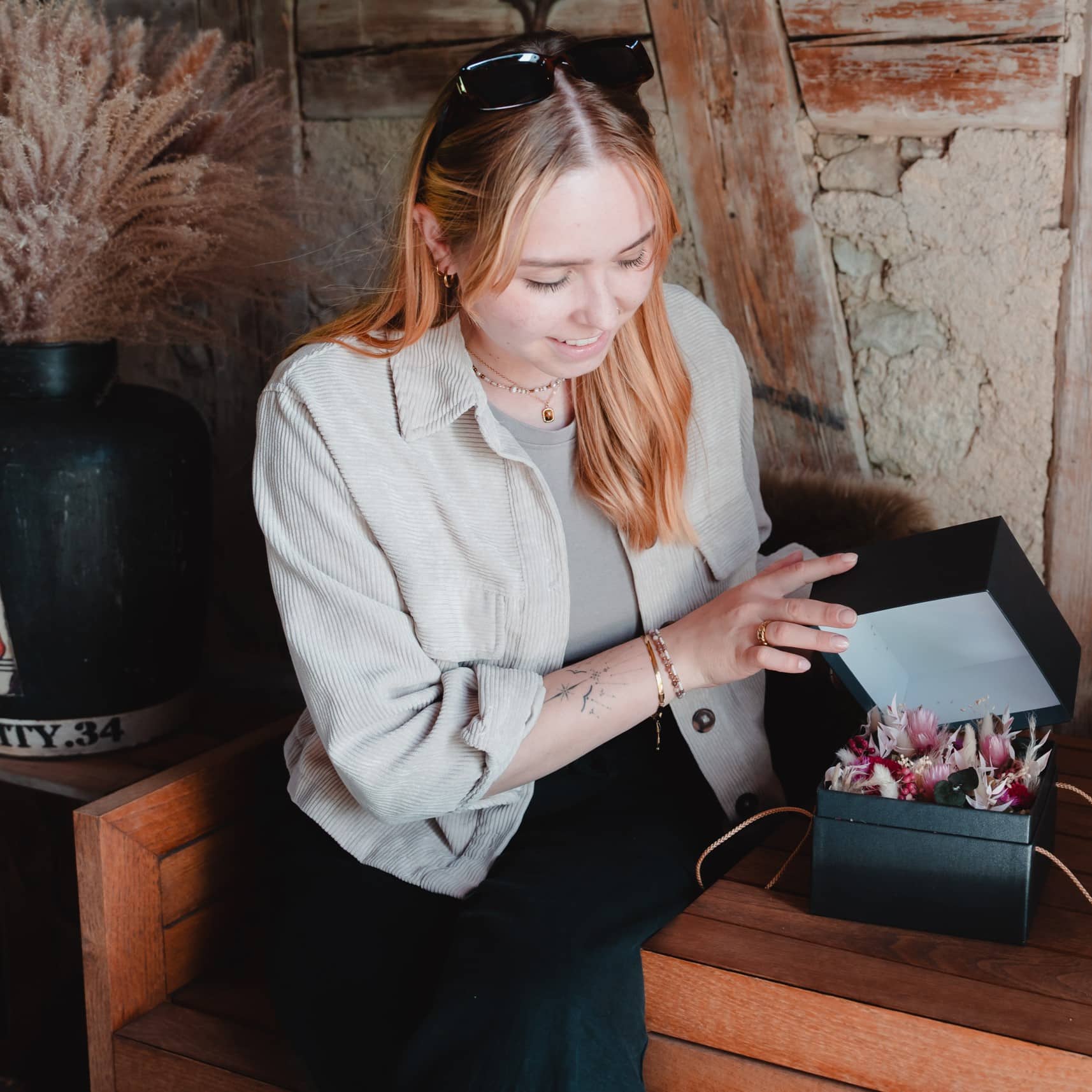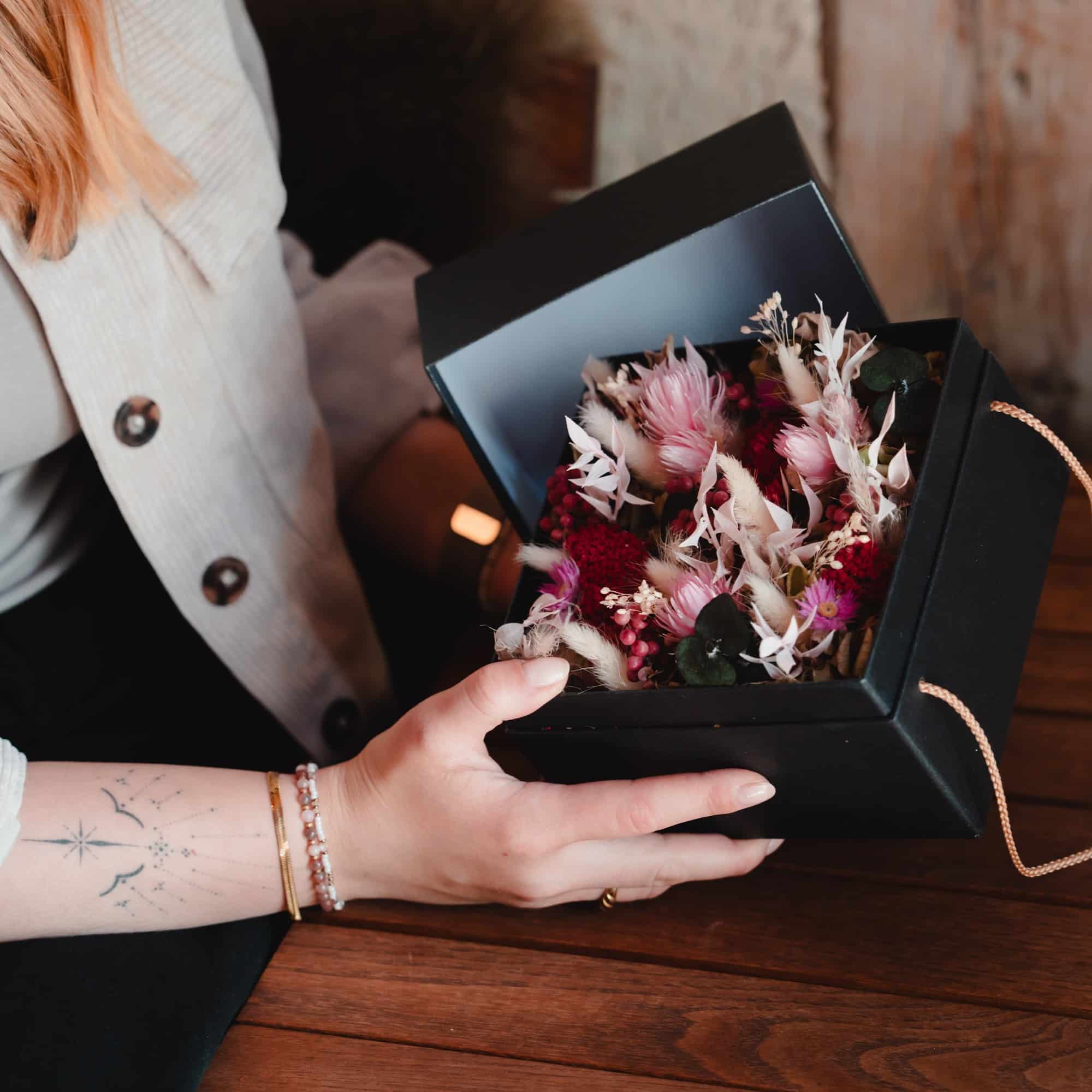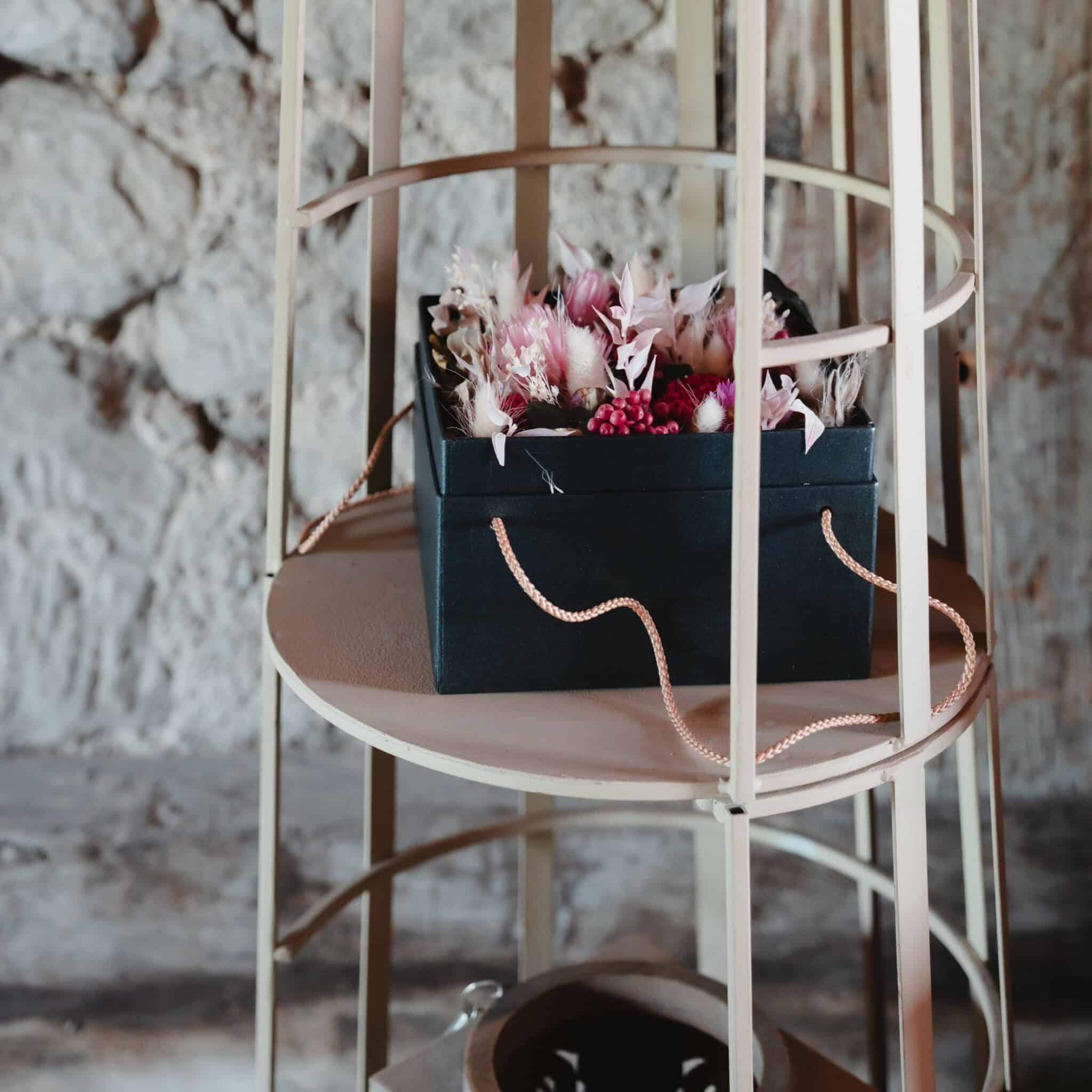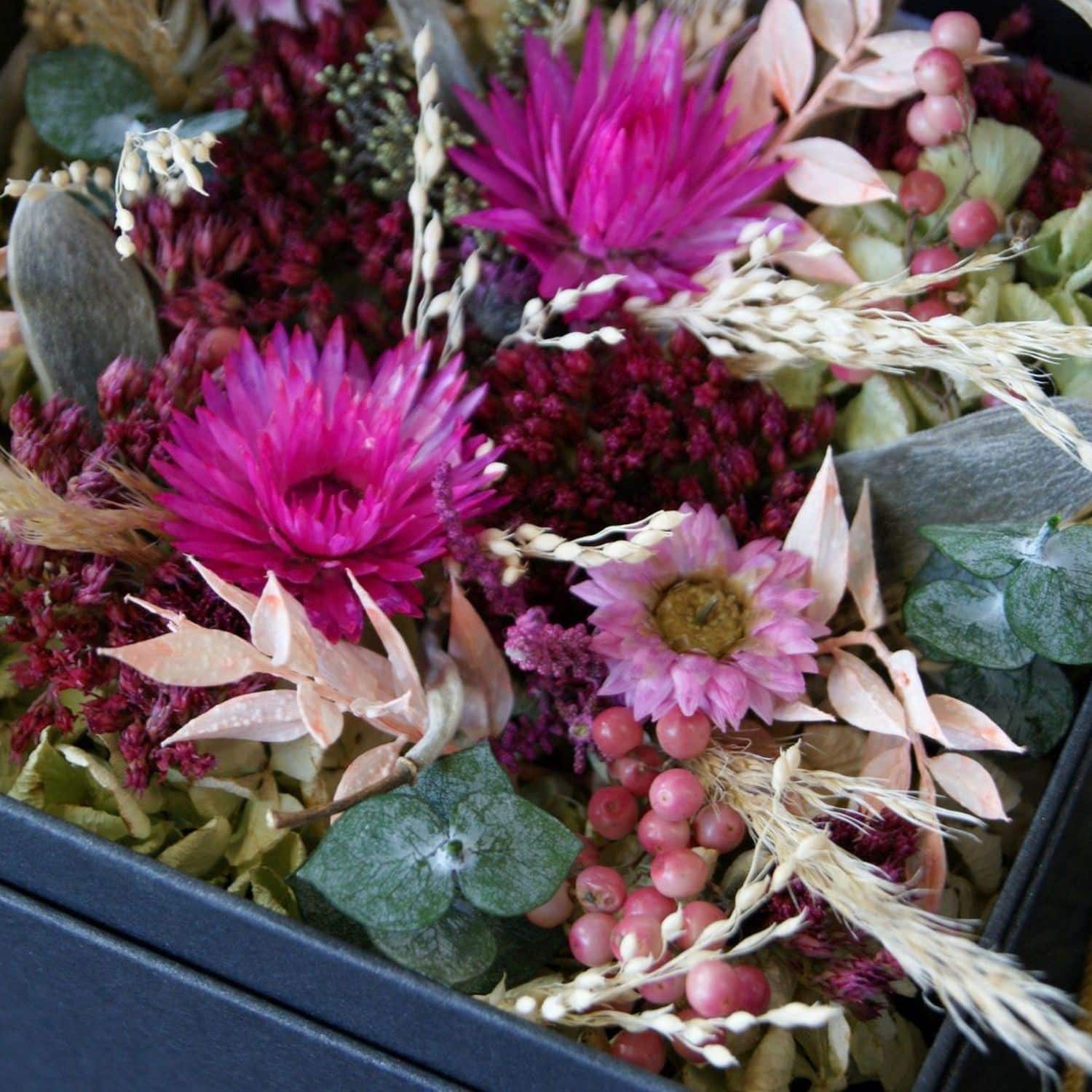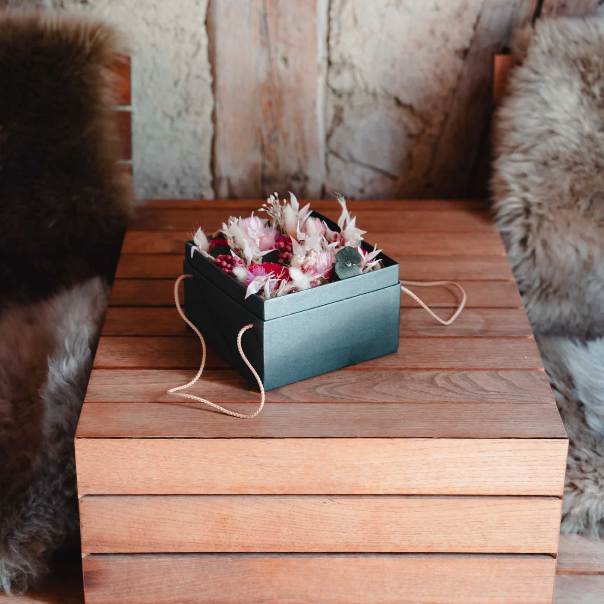 Schwarze Schachtel mit Trockenblumen in Pink 15cmx15cm
