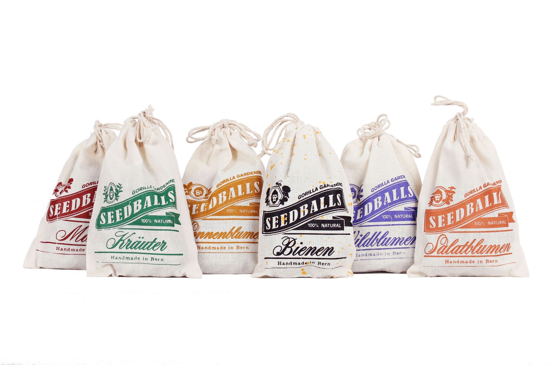 In schönen im Siebdruckverfahren bedruckten Baumwollbeutel. Die Seedballs werden von Hand gerollt.