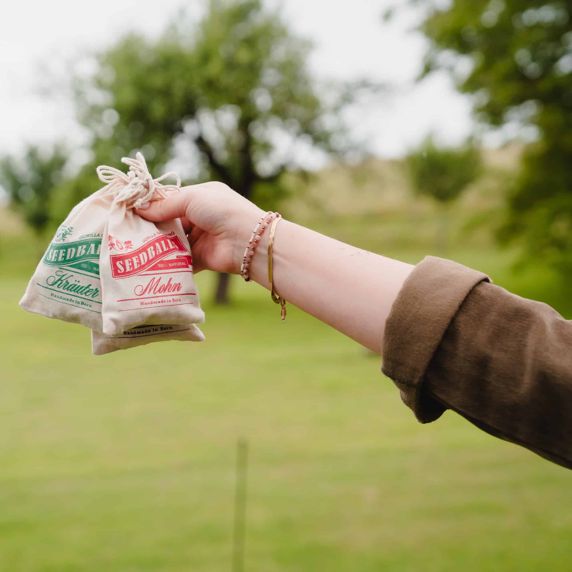 Die Seedballs werden von Hand gerollt, die Baumwollbeutel werden im Siebdruckverfahren bedruckt.