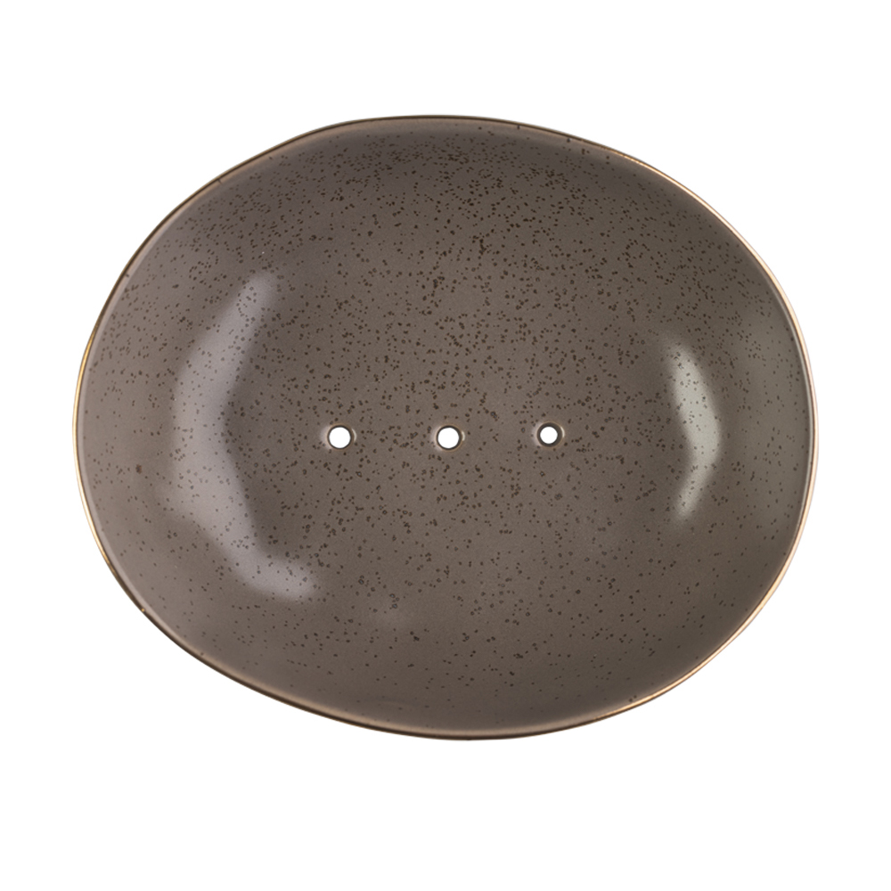 Diese stilvolle Seifenschale ist ein echter Blickfang – die gesprenkelte, matte Glasur verleiht ihr Charakter. Durch die runde Form und Ablauföffnungen bleibt die Seife trocken und griffbereit.