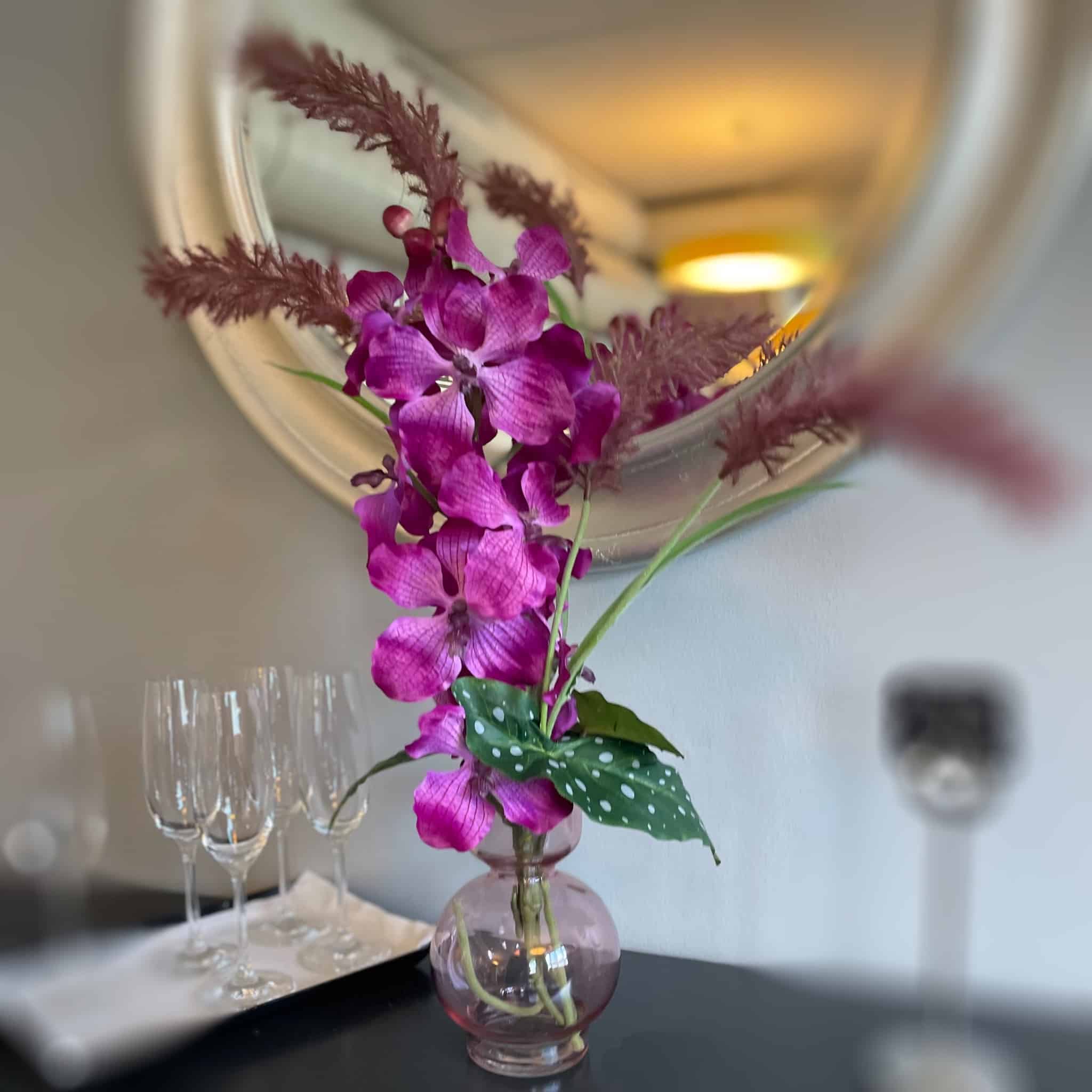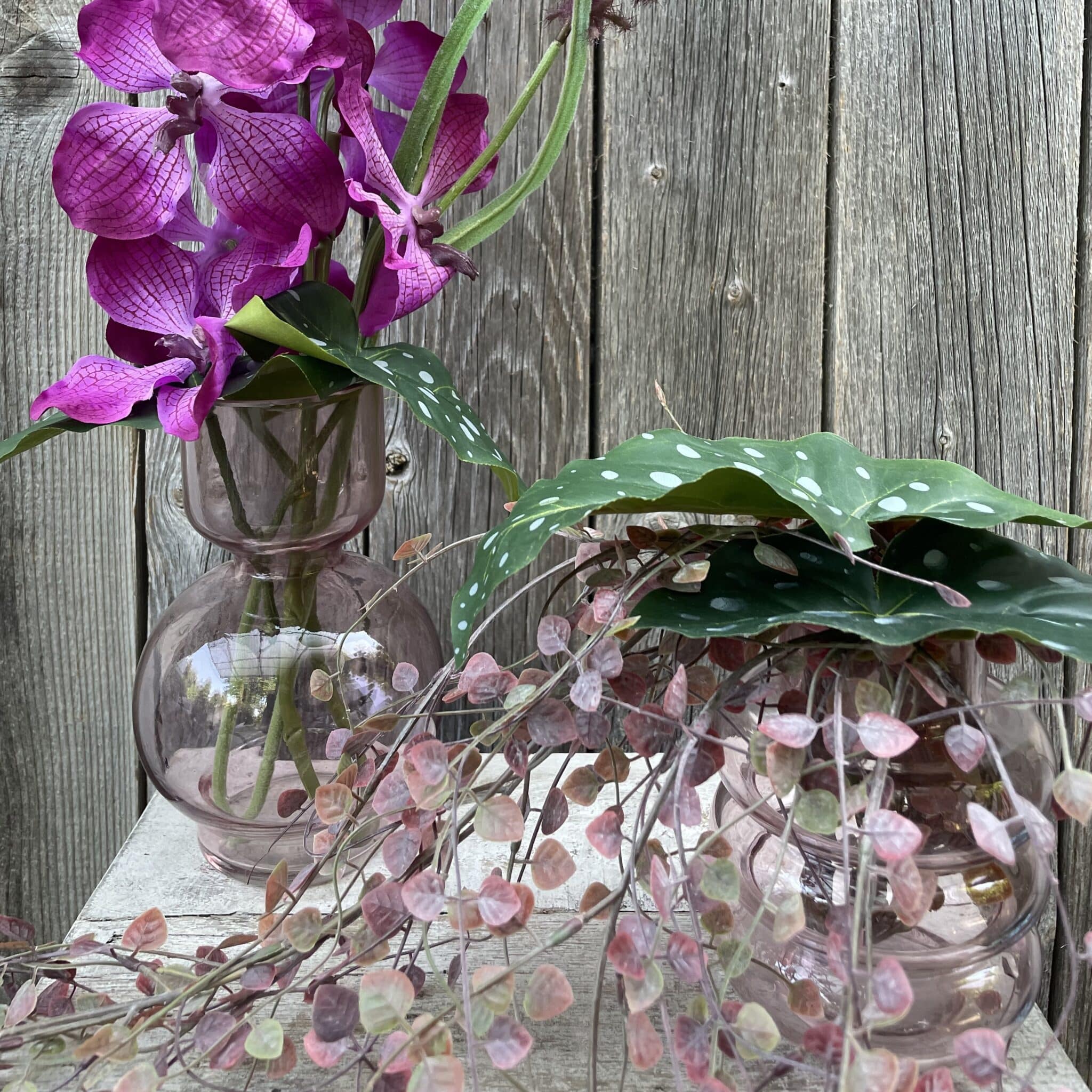 Der angegebene Preis gilt pro 2er-Vasen Set mit Vanda Orchidee und Vase mit Peperomia Ranken , wobei sich das Design der Vase je nach Verfügbarkeit variieren kann.