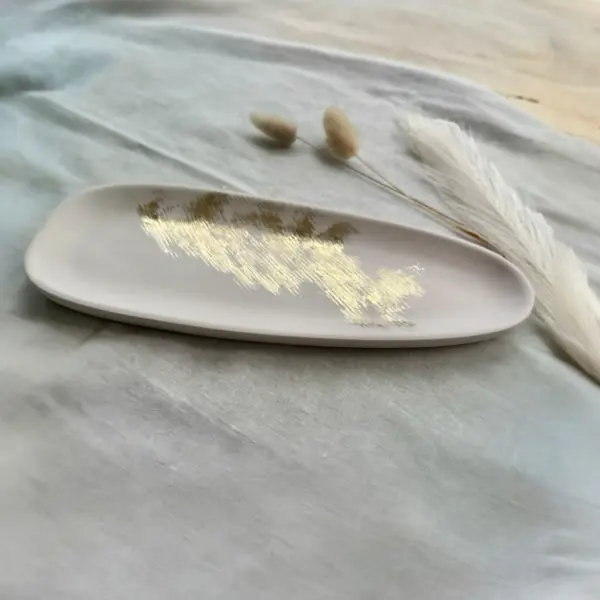 Ein handgefertigter, länglicher Tray aus mineralischem Eco-Komposit, veredelt mit einem zarten, handaufgetragenen Goldakzent. Die matte Latte-Oberfläche in warmem Beige und die feine Goldstruktur verleihen Shoreline eine moderne, dezente Eleganz.