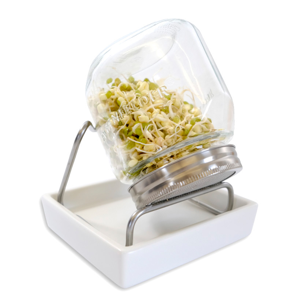 Die schräge Position des Keimglases sorgt dafür, dass das Wasser ablaufen kann. Das feinmaschige Sieb unterstützt die Luftzirkulation. Die Keramikschale fängt das Abtropfwasser auf, so dass das System an jeden beliebigen Platz gestellt werden kann. Die Saaten werden im Sprossenglas eingeweicht, gespült und bis zur Ernte gezogen. Bitte beachte, dass diese Sprossengläser nicht für schleimbildende Saaten geeignet sind. Schleimbildende Saaten sind z.B. Kresse, Rucola, Senf, Chia und Leinsamen, die einen «ruhenden Boden» beanspruchen. Hierfür eignen sich Kressesiebe.