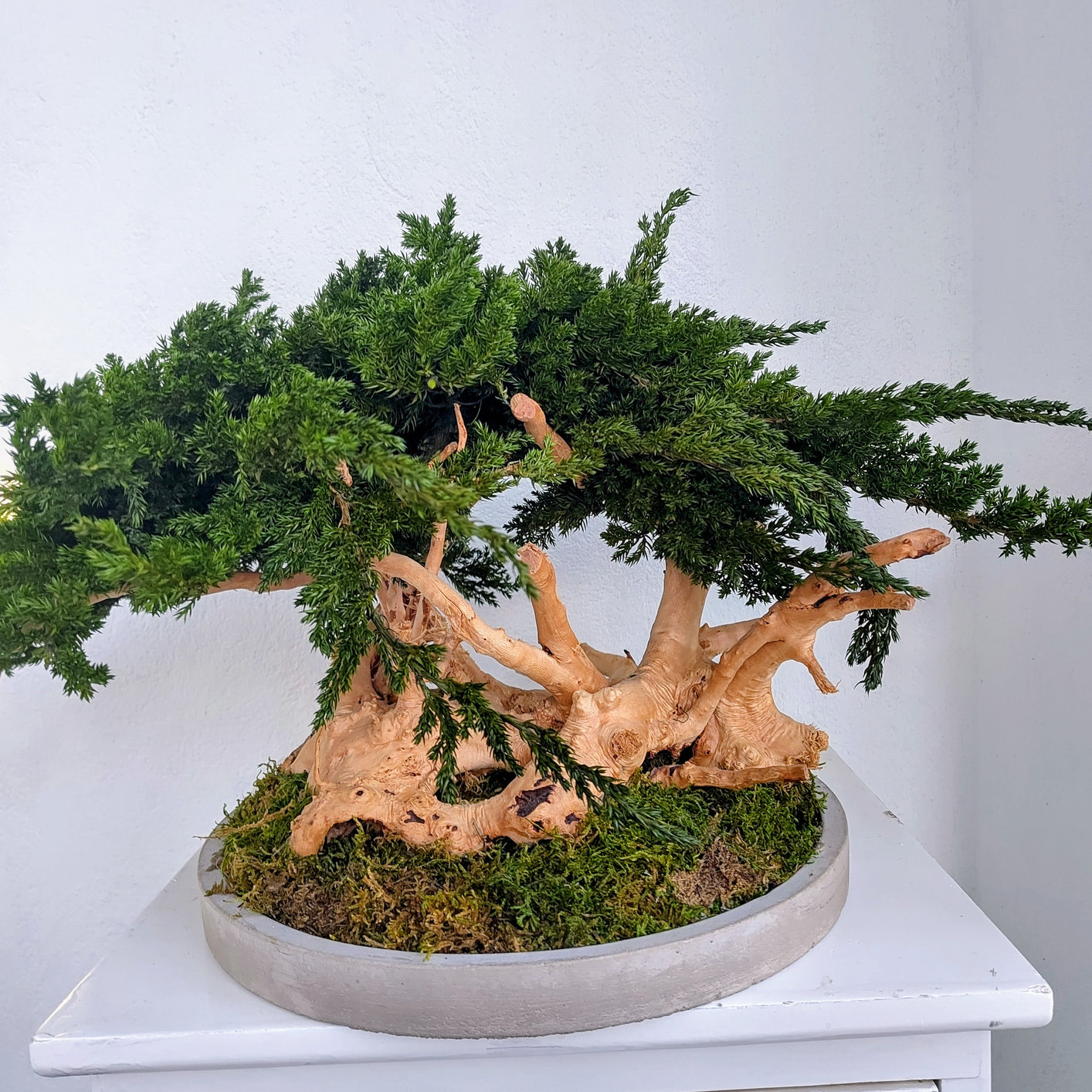Die Schale hat einen Durchmesser von etwa 32 cm und der Bonsai ist etwa 30 cm hoch. Es handelt sich um ein Unikat.