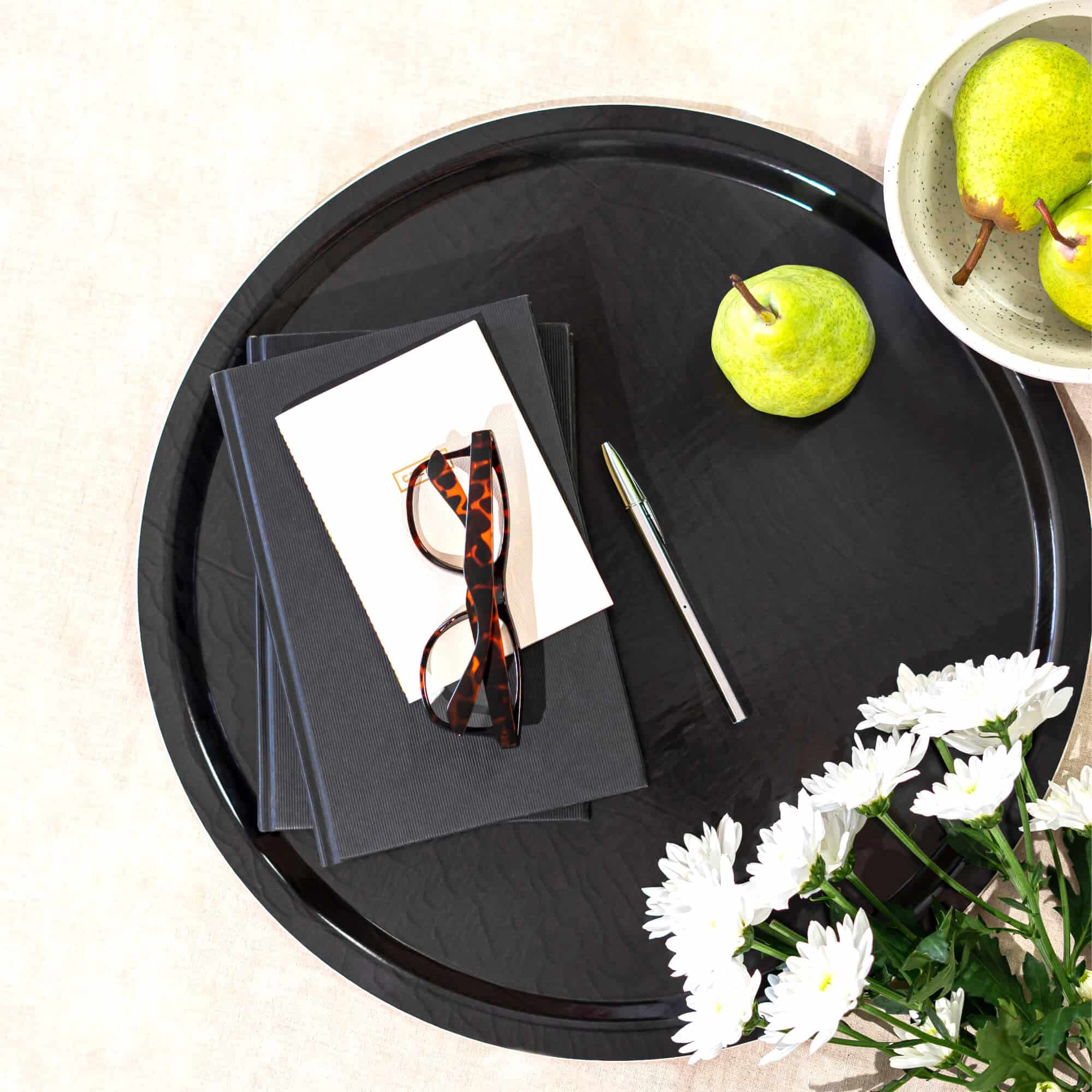 Entdecke unsere Unicolor-Kollektion, die als markante Einzelstücke allein stehen oder hervorragend mit einem anderen HappyTrays-Design kombiniert werden kann. Das ‚Black Sea‘-Tablett verleiht jedem Raum, durch seine anthrazitfarbene Gestaltung und wellenartiges Design, eine Note von Eleganz und Modernität.