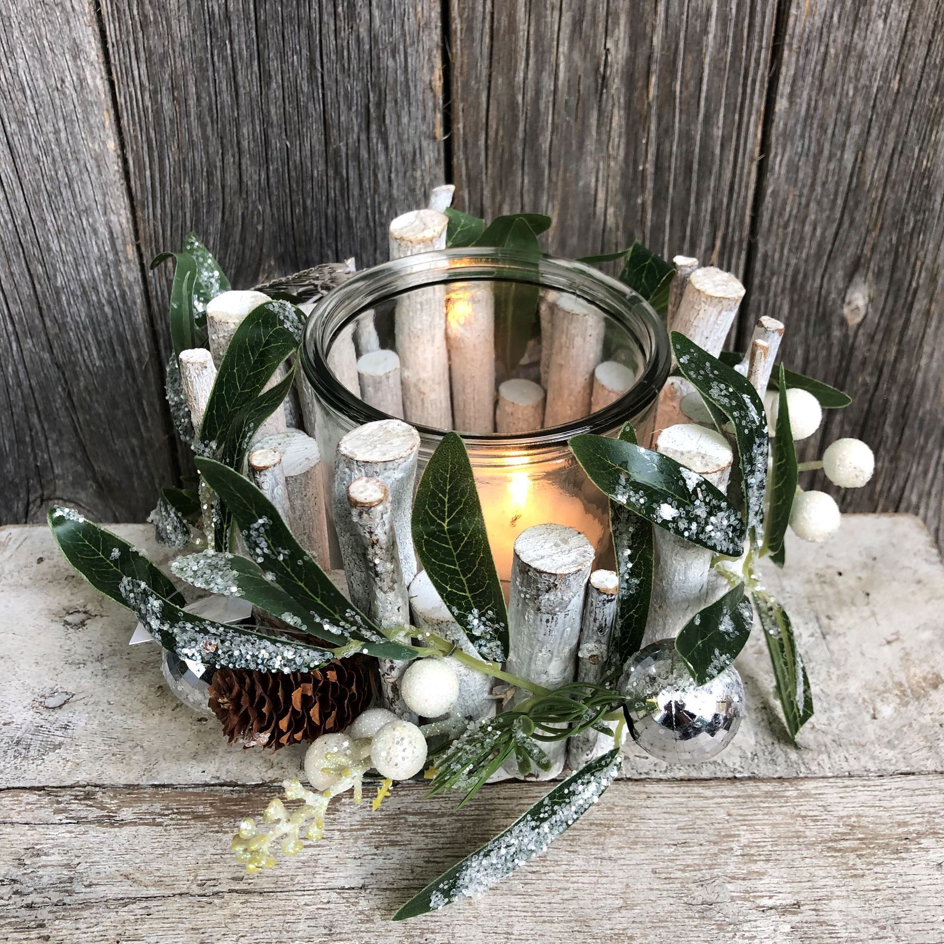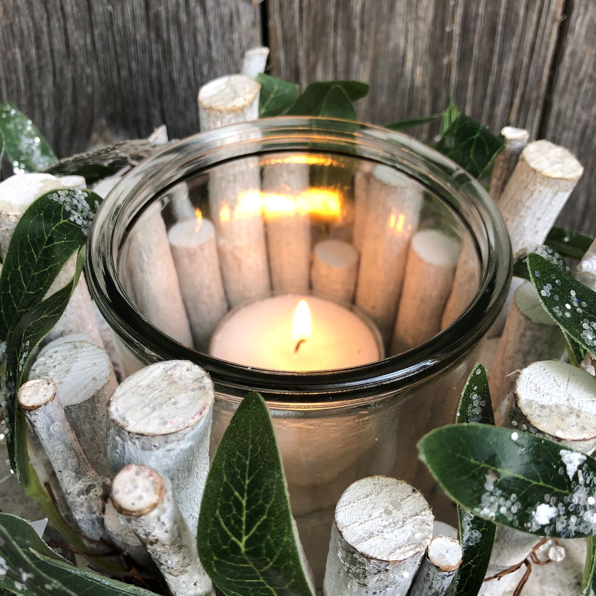 • Die Teelichter aus Kunst-& Dekomaterialien und Holzzweigen werden individuell zusammengestellt und können so in Anordnung und Farben variieren. Die Holzzweige können auf dem Tisch auch uneben sein.