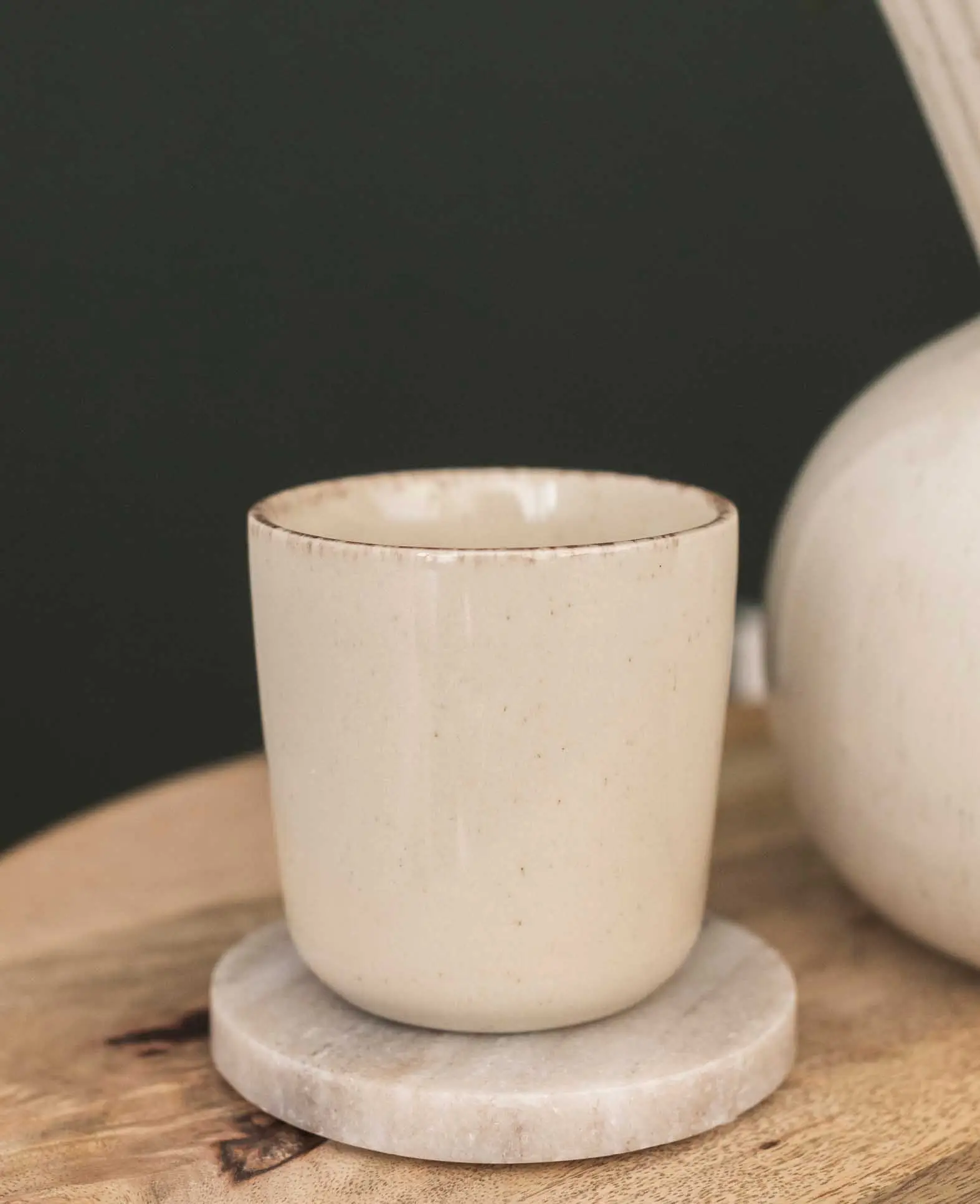 Handglasierte, zeitlose Tasse für Tee oder Kaffee ohne Henkel aus cremefarbenem Porzellan.