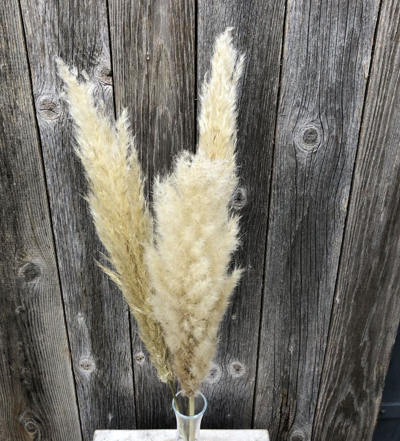 Pampasgräser sind ein Naturprodukt und können in Anordnung, Farbe und Grösse der einzelnen «Büschel» variieren. Einzelne Büschelgräser können durch den Trocknungsprozess auch angebrochen sein oder Trockenreste der Knospenhülle / Samen enthalten.
