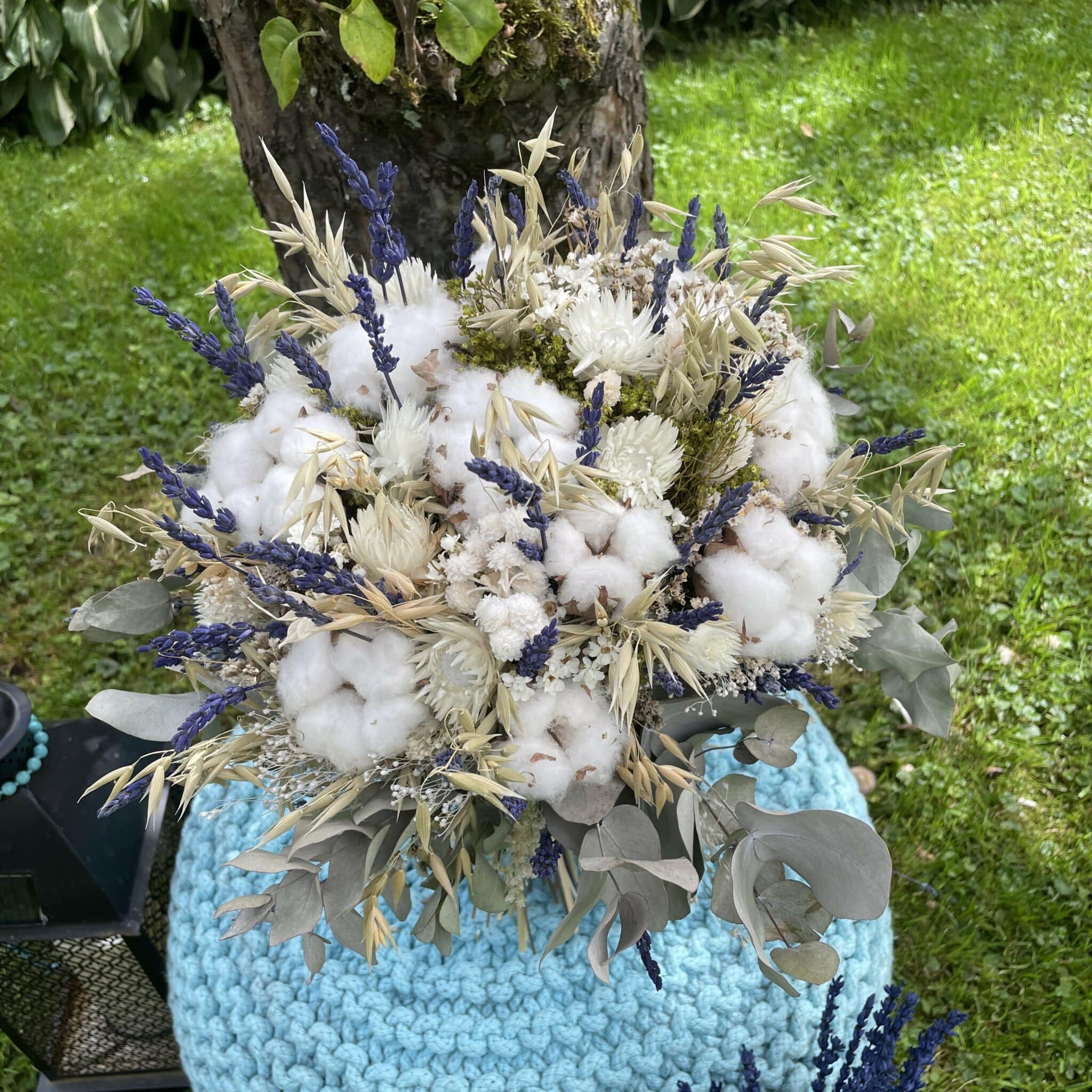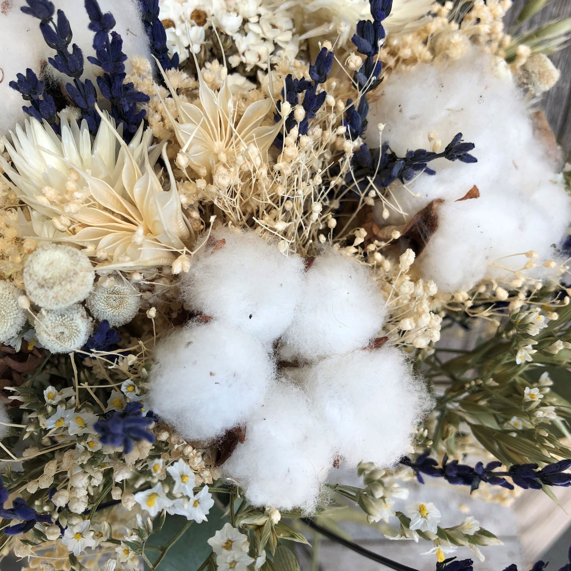 Trockenblumen – Der neue Interior-Trend; Trockenblumen Strauss Bouquet «Creme» mit Baumwolle – Eukalyptus & Lavendel Ø ca.20 cm H ca.35 cm