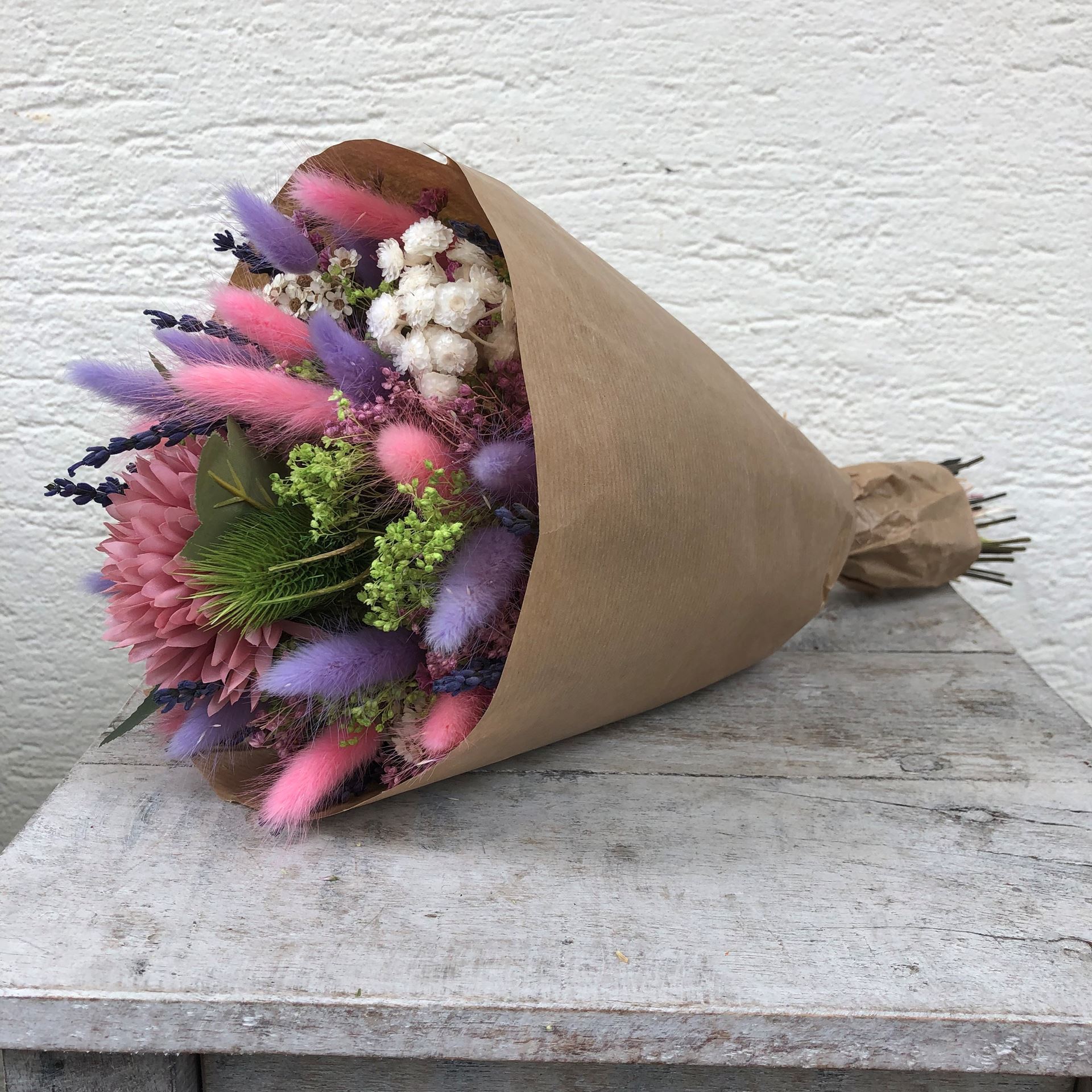 • Packe die Trockenblumen bitte vorsichtig aus dem Papier. Getrocknete Zweige sind leichter brüchig als noch im grünen Zustand.