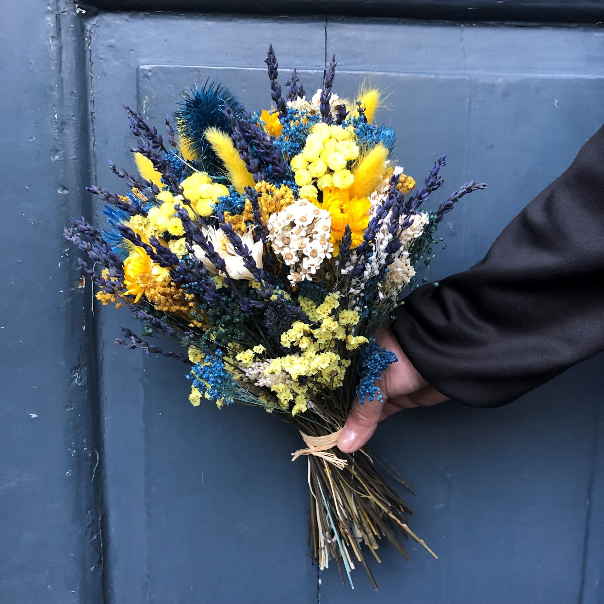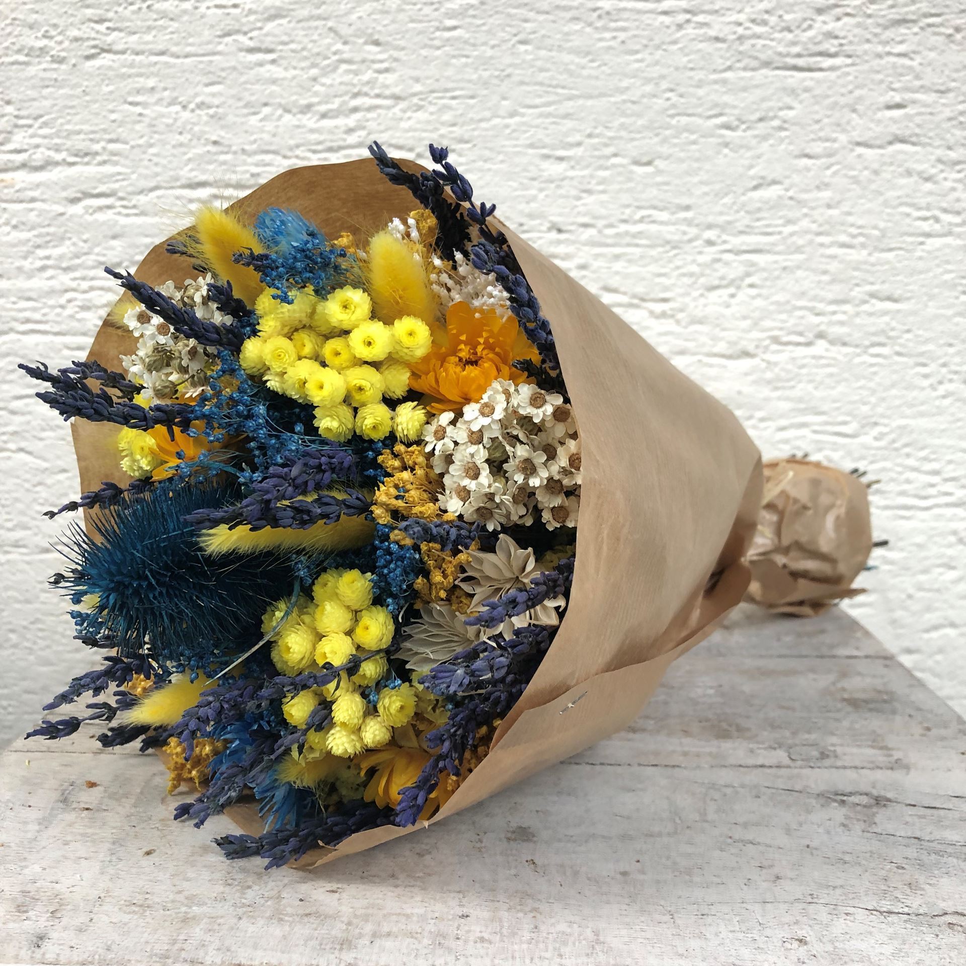 Trockenblumen – Der neue Interior-Trend; Trockenblumen Strauss Bund mix «giallo blu»