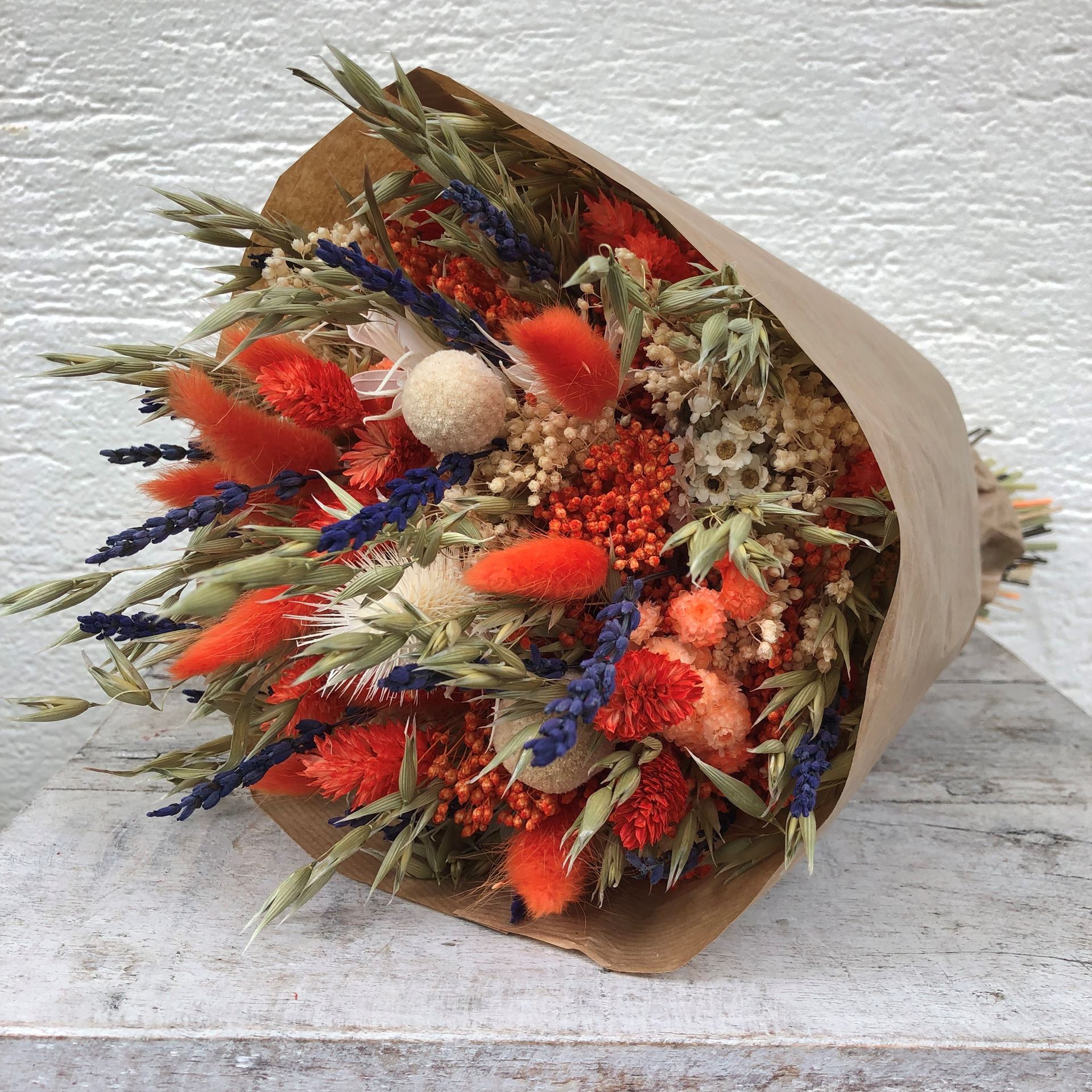 • Trockenblumen sind ein Naturprodukt und die Sträusse / Einzelblumen werden saisonal individuell zusammengestellt und können so in Anordnung und Farbe variieren.