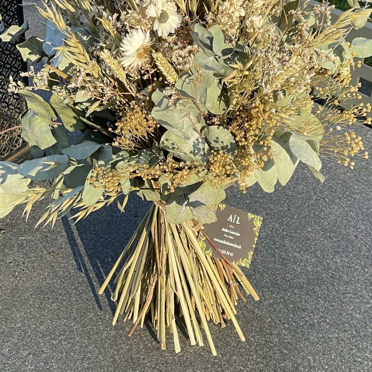 • Für die Gestaltung werden als technische Hilfsmittel zum Teil Draht, Spaltbambus, Leim und ähnliches verwendet welche auch sichtbar sein können. Unsere Trockenblumen werden ergänzend teilweise gebleicht oder eingefärbt. Die im Musterstrauss (Foto) verwendetet Farbe kann so auch von Strauss zu Strauss variieren. Ebenso das für die Verpackung verwendete Papier.