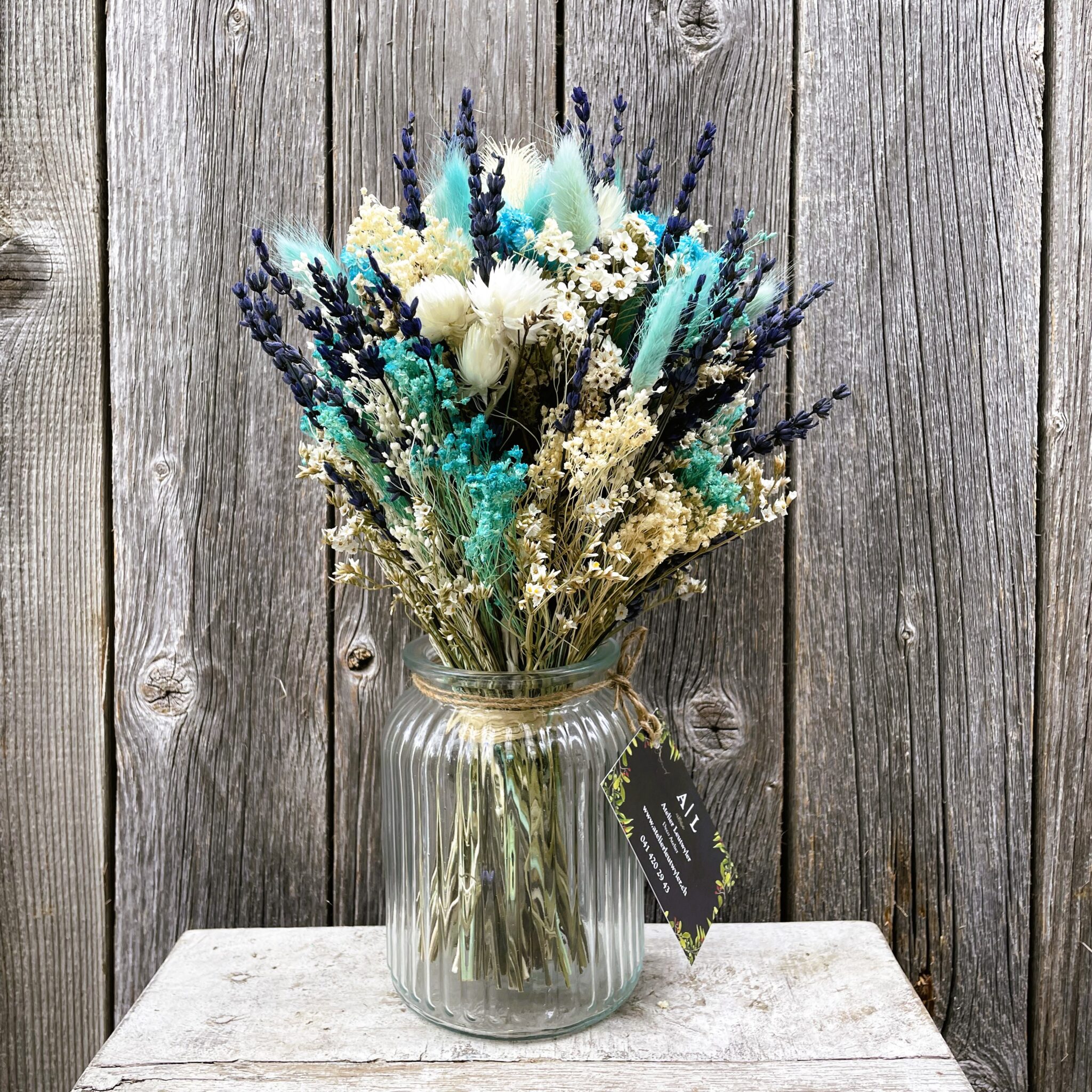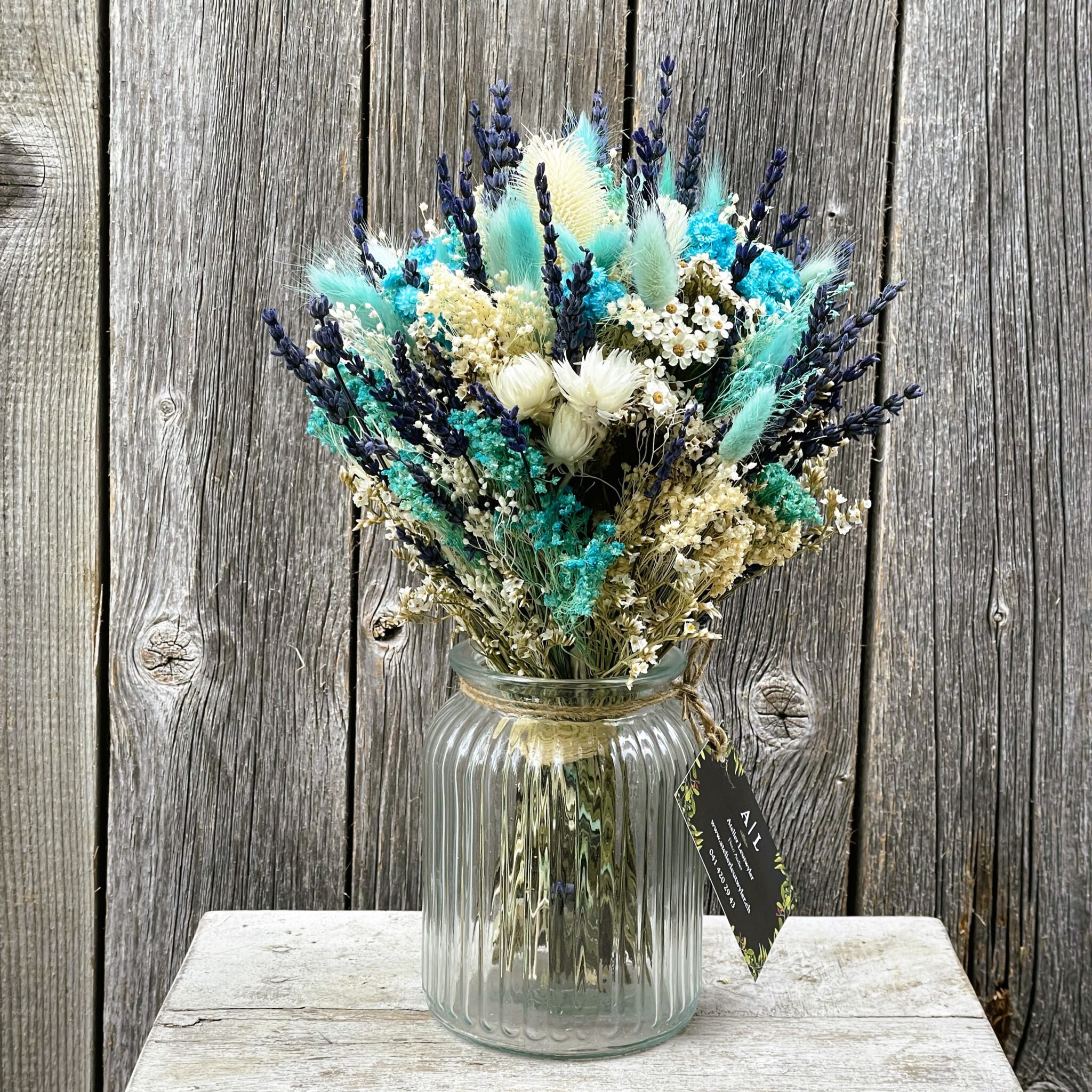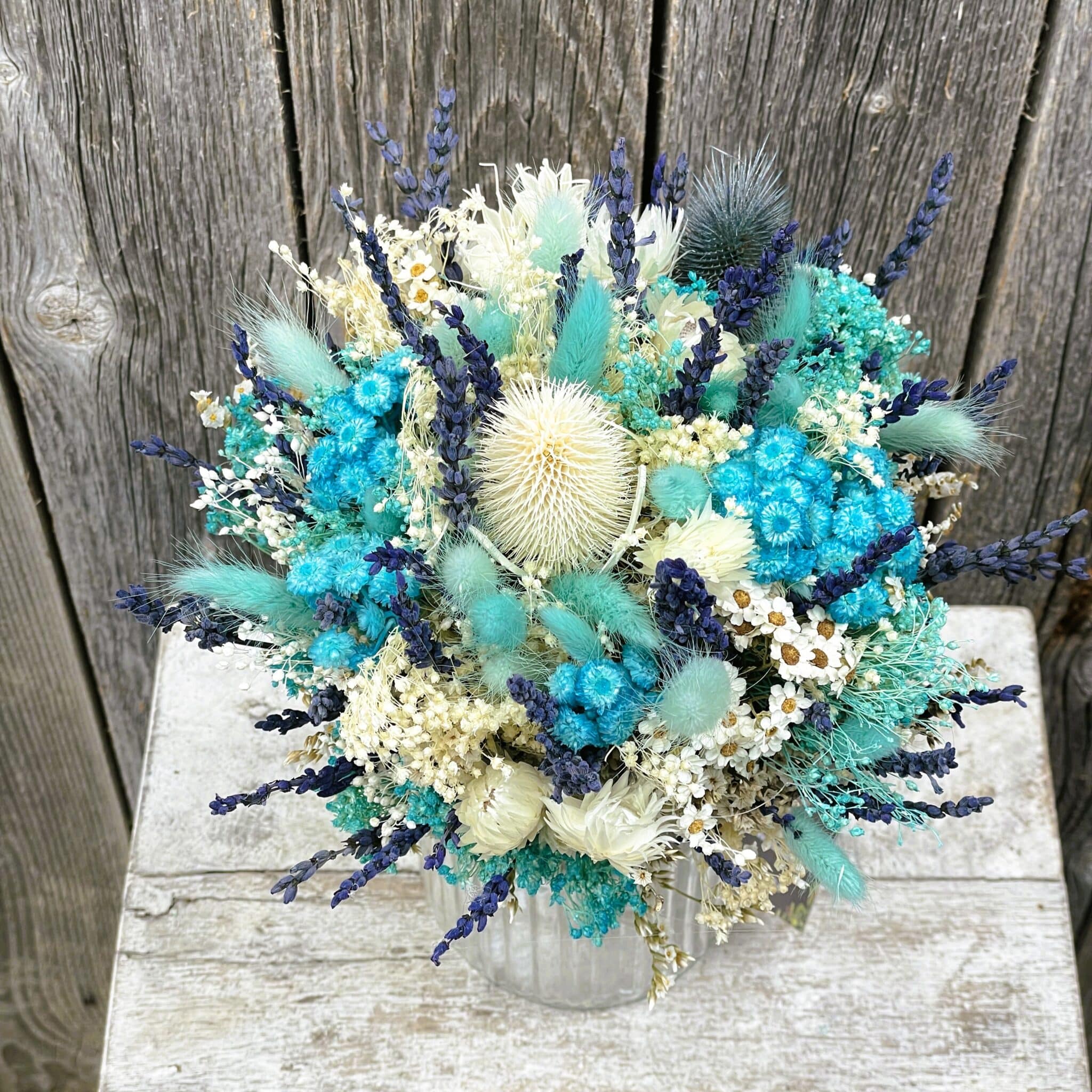Trockenblumen – Der neue Interior-Trend; Trockenblumen Strauss Bund mix «Türkis-Weiss» mit Vase Ø ca.17 cm H ca.30 cm / Vase leer ohne Strauss H ca. 18 cm