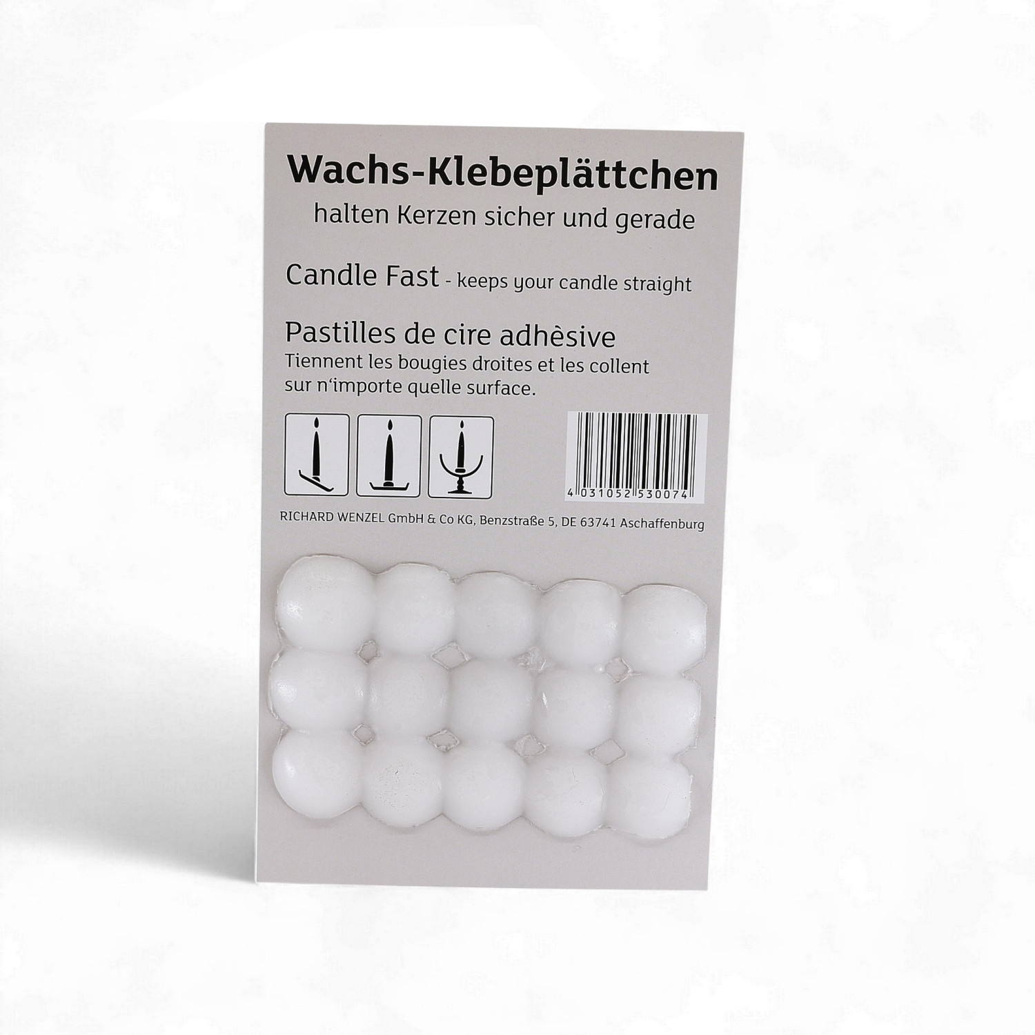 Die Wachs-Klebeplättchen sorgen dafür, dass Kerzen sicher und gerade in ihrem Halter stehen. Einfach ein Plättchen auf den Kerzenfuss drücken – schon haftet die Kerze fest und stabil auf nahezu jeder Oberfläche. Ideal für Stab-, Spitz- oder Tafelkerzen.