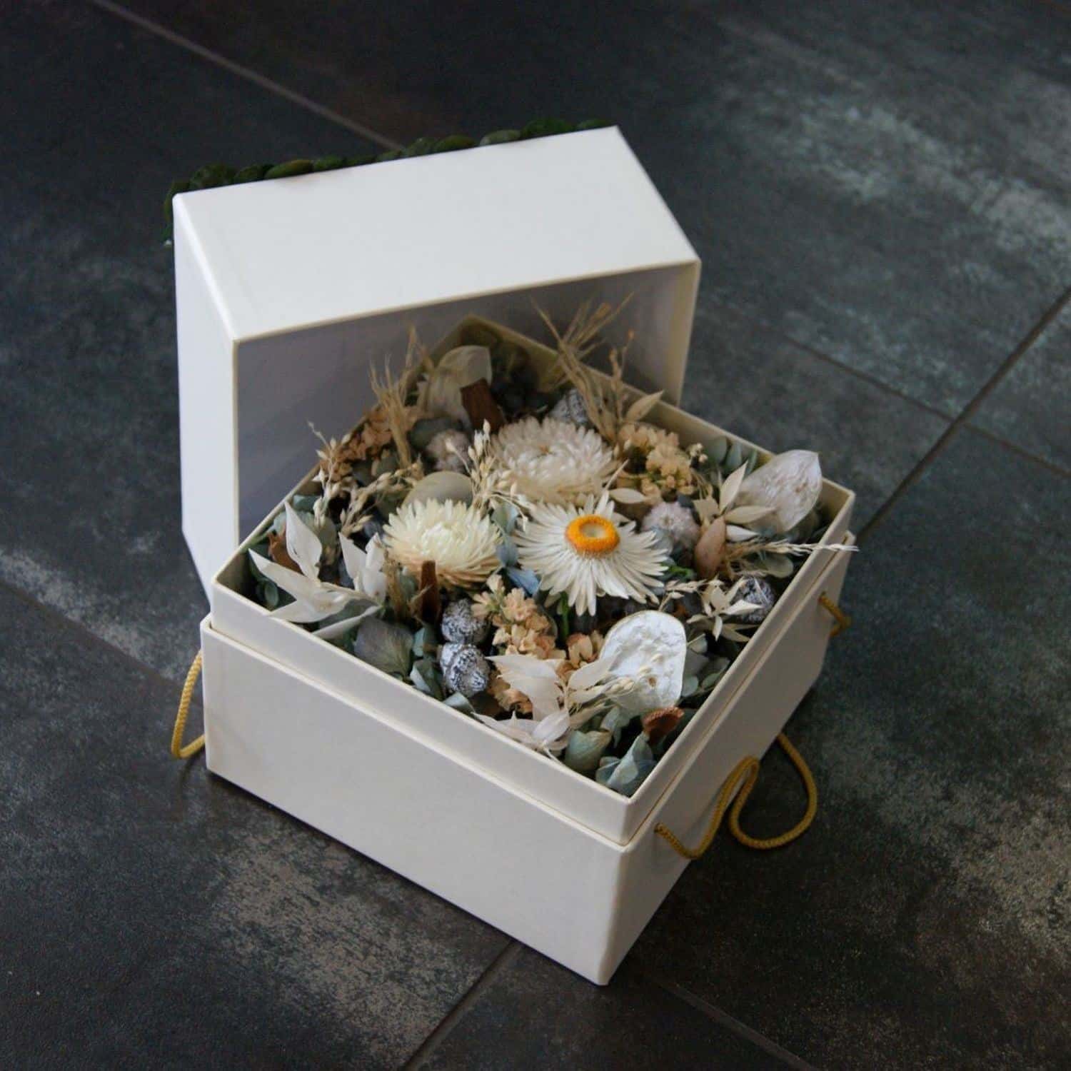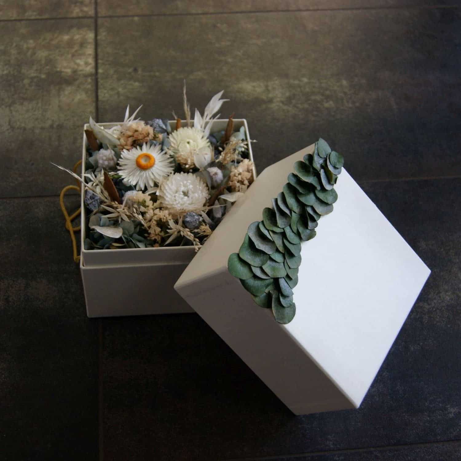 Weisse Schachtel mit rosa Trockenblumen 15cmx15cm