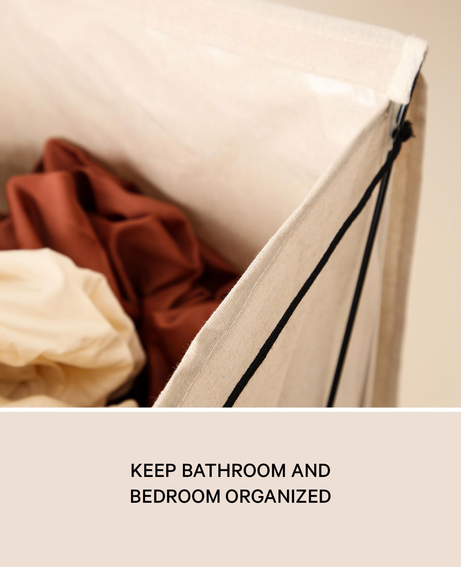 Zusammenfaltbarer cremefarbener Wäschekorb aus Baumwolle, mit stabilem, schwarzem Metallgestell und Deckel mit Gewicht, H 66 x B 45 x T 40 cm