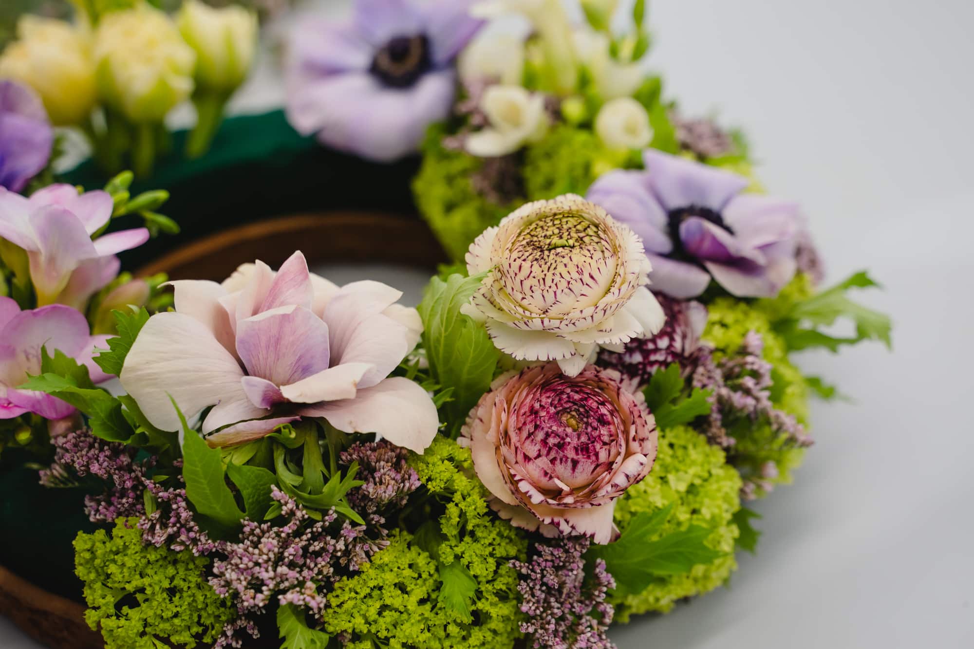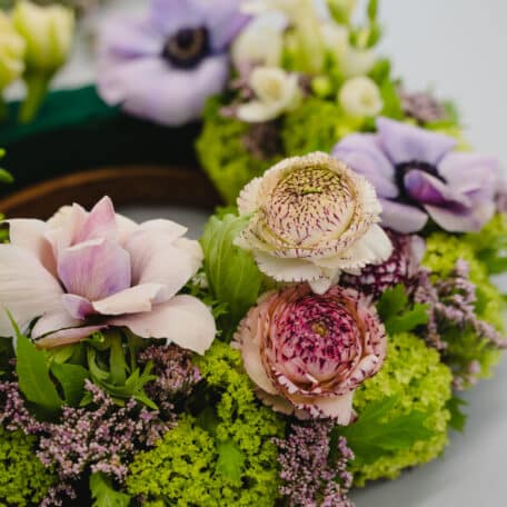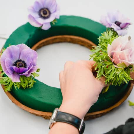 Achte darauf, dass die Oasis-Steckmasse immer genügend Feuchtigkeit hat, damit die Blumen möglichst lange frisch bleiben. Stelle den Kranz auf eine Unterlage, damit sich auf den Möbeln keine Wasserflecke bilden. Welke Blumen kann man durch frische ersetzen.