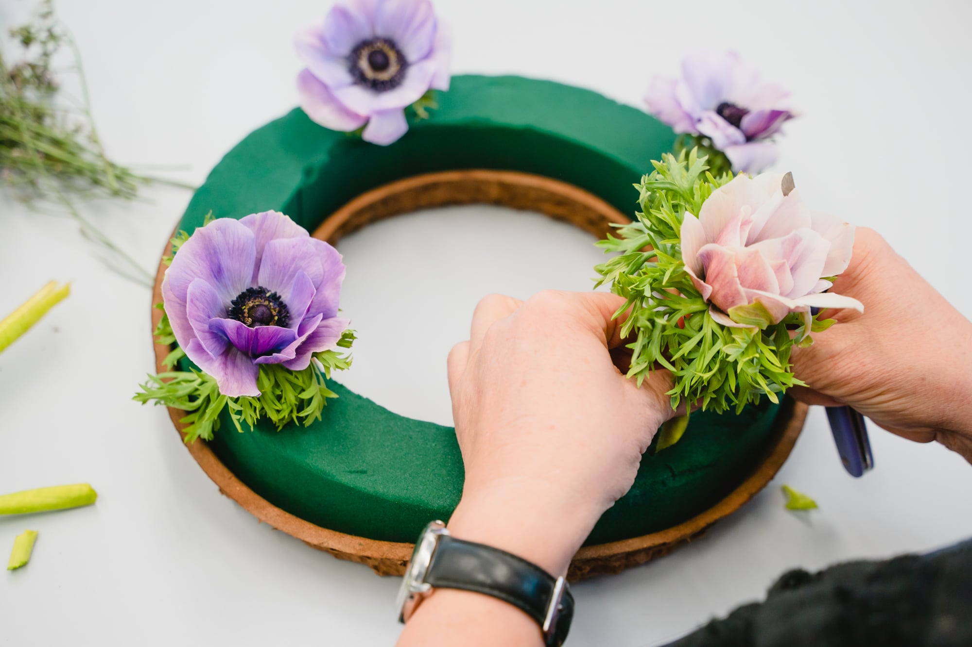 Oasis so mit Blumen und Eukalyptus bestecken, dass der Steckschaum nicht mehr zu sehen ist.