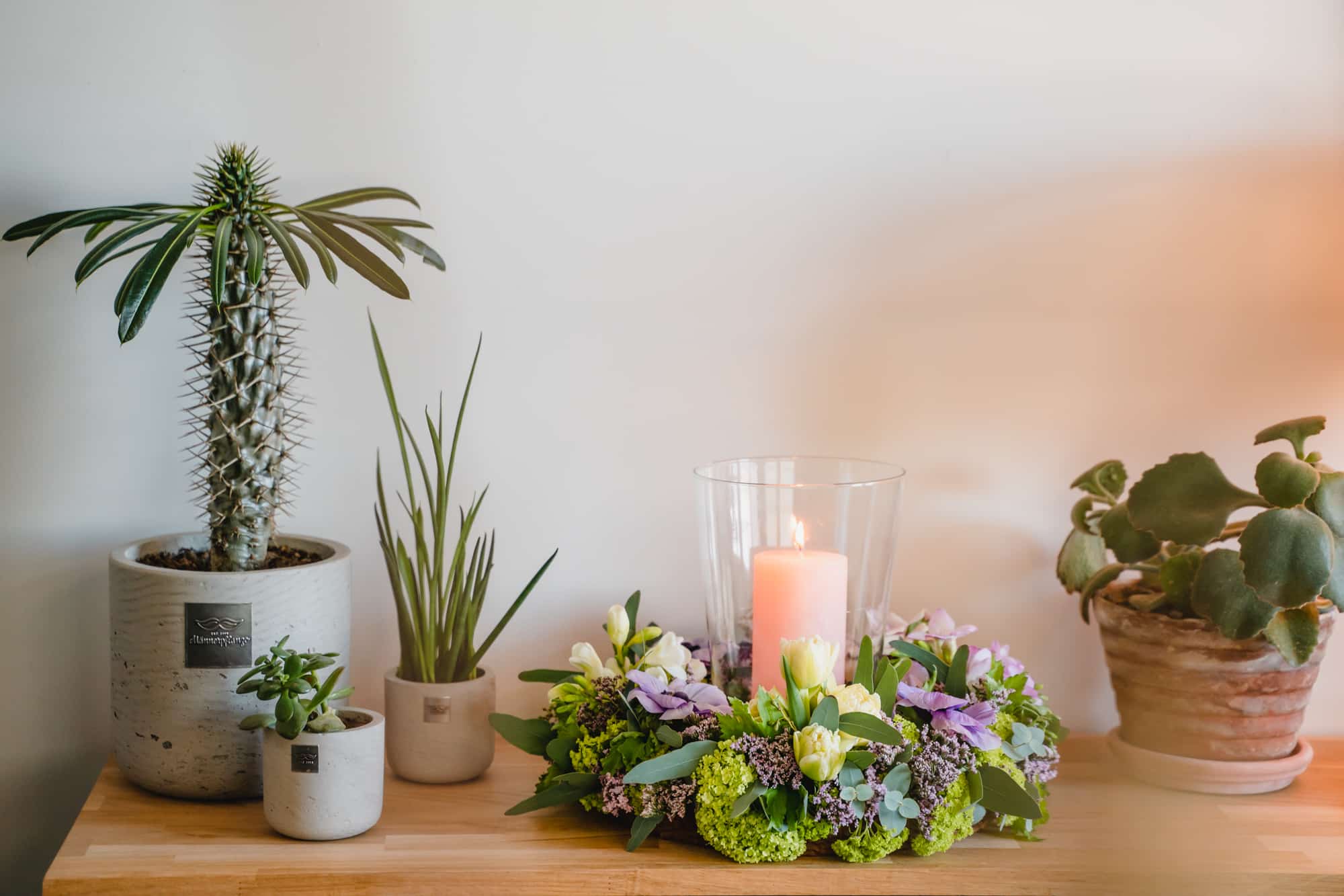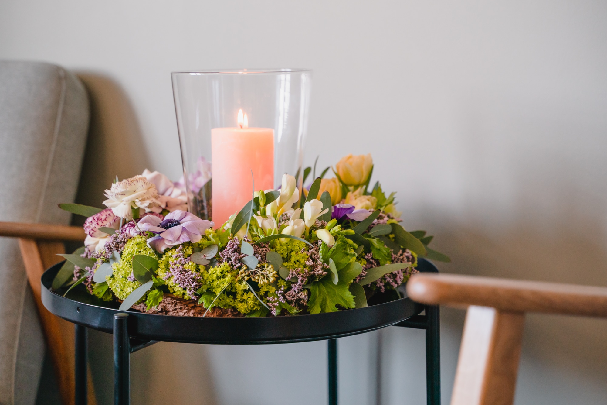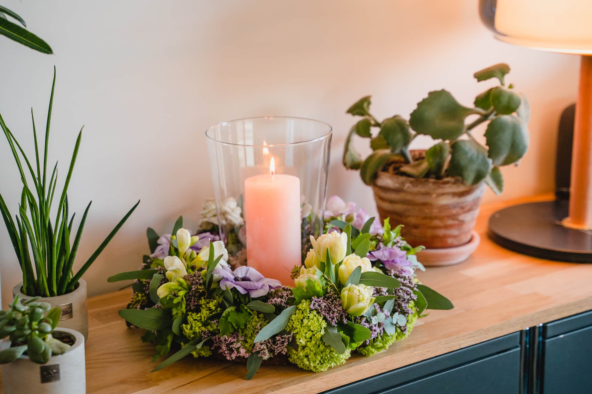 Stelle das Glas mit der Kerze in die Mitte des Kranzes.