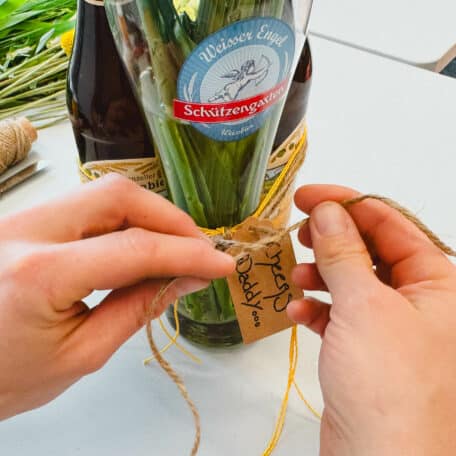 Schreibe einige liebe (oder witzige) Worte für Deinen Vater auf die Etikette und knüpfe diese an den Schnüren fest.