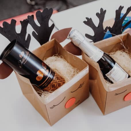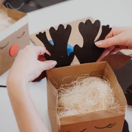 Schneide aus schwarzem Moosgummi das Geweih, aus braunem Moosgummi die Ohren und klebe diese ebenfalls an die Boxen.