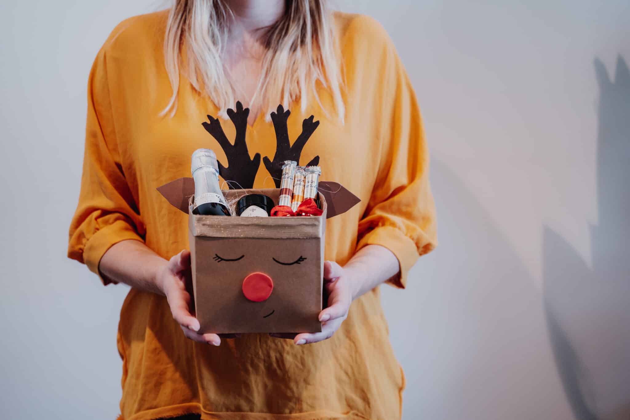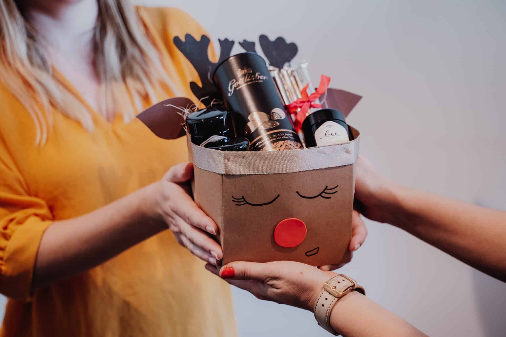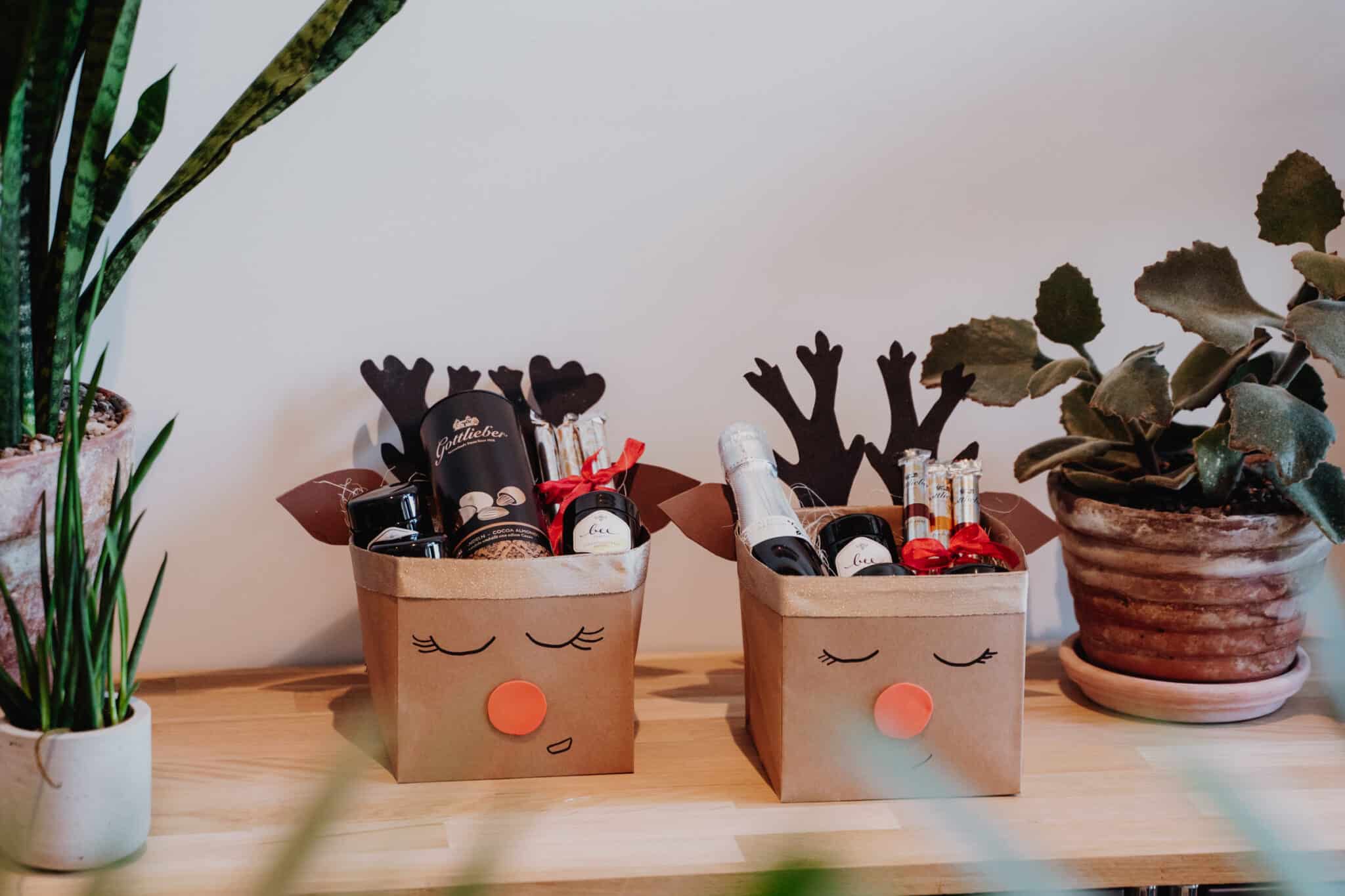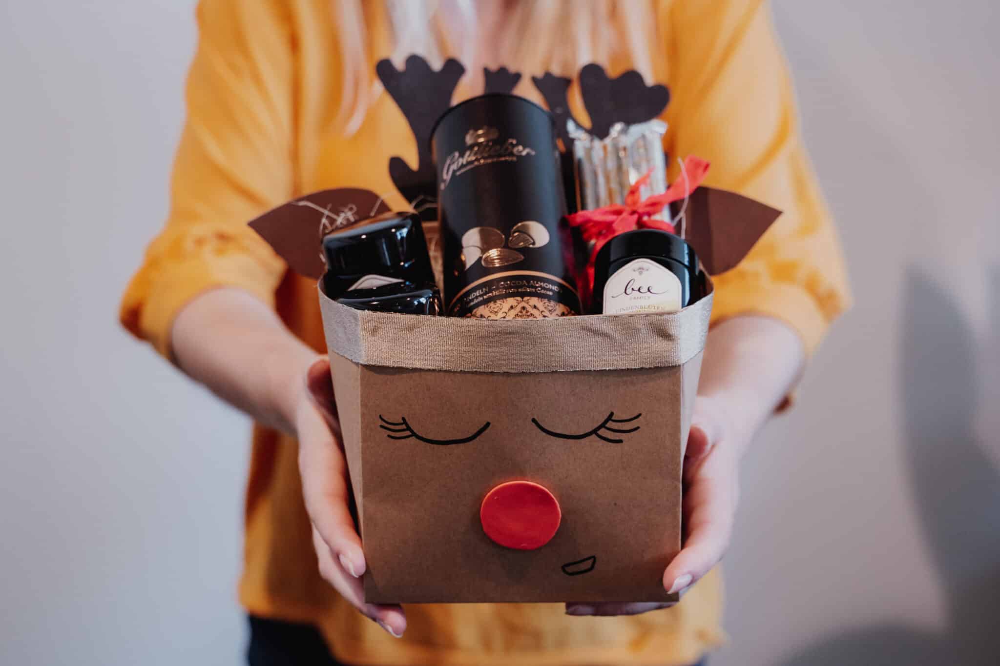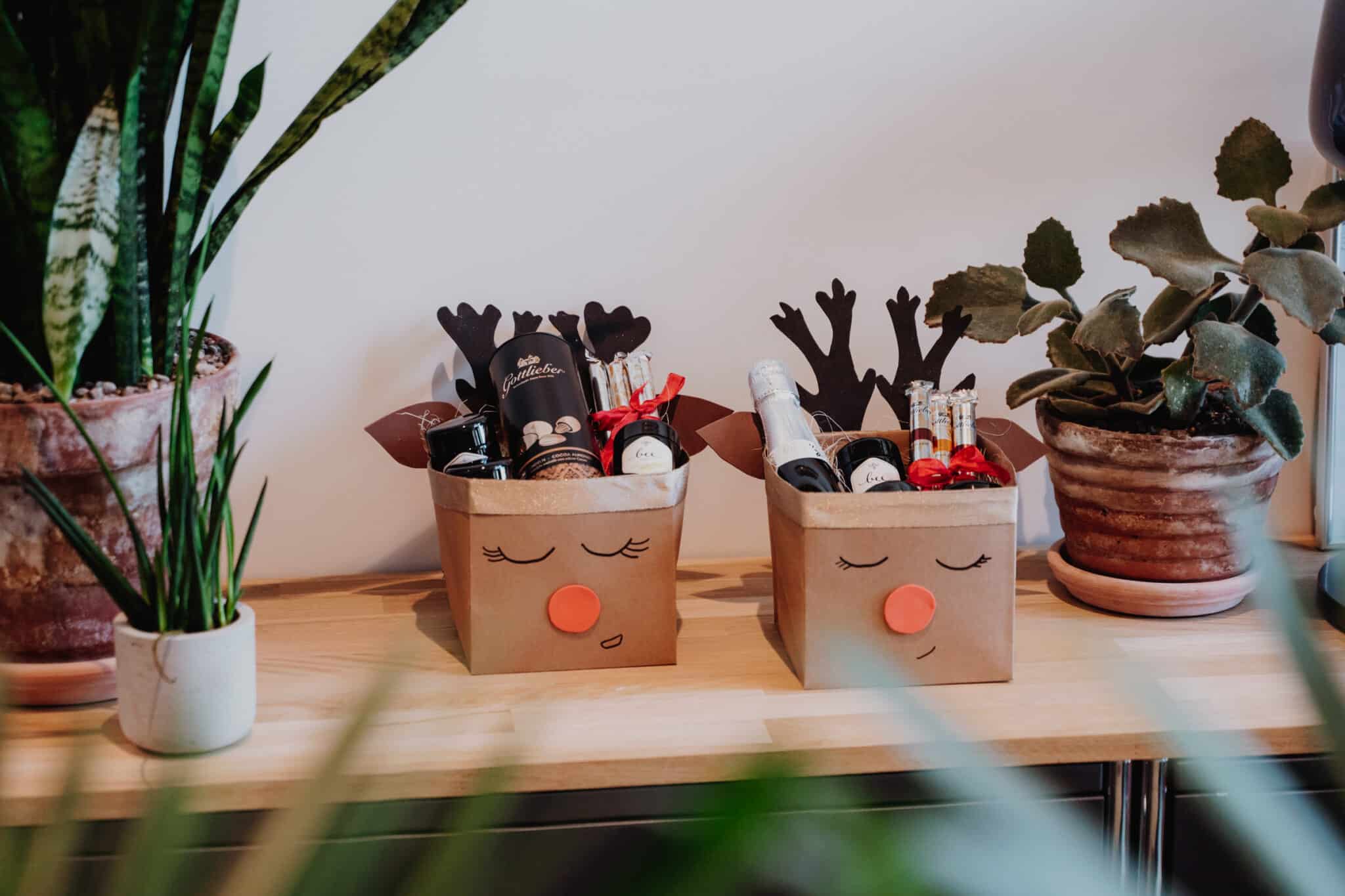 Damit du die Geschenke im Behältnis fixieren kannst, gib Sisal (oder Seidenpapier) hinein und platzieren dann Hüppen, Prosecco, Cacaomandeln, Honig usw.