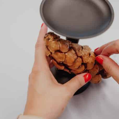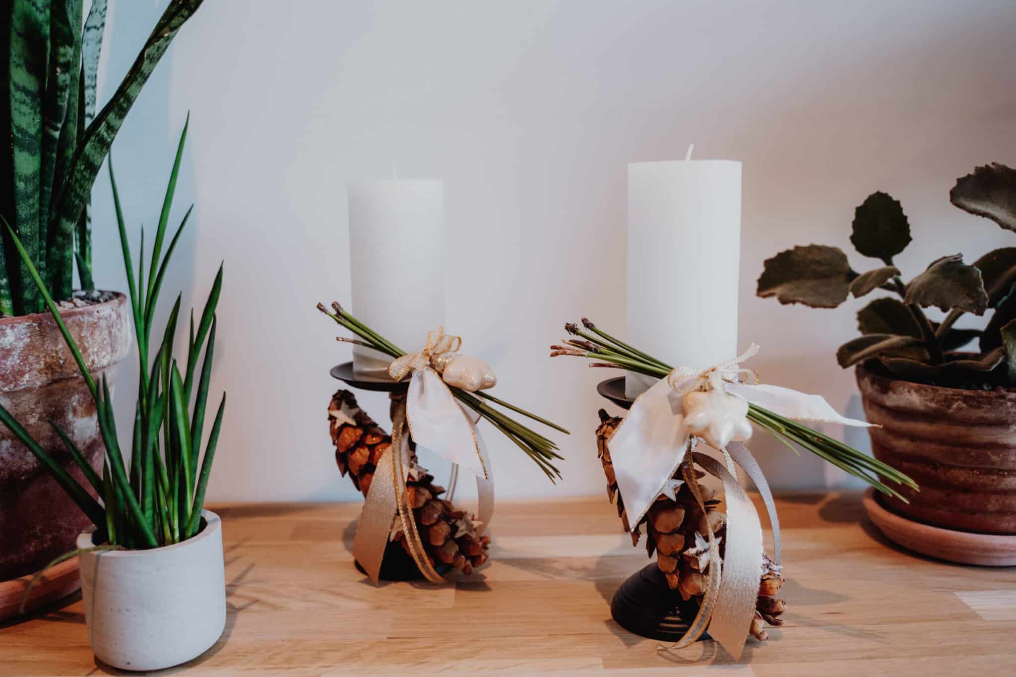Binde den Zapfen mit Wickeldraht am Kerzenständer fest.