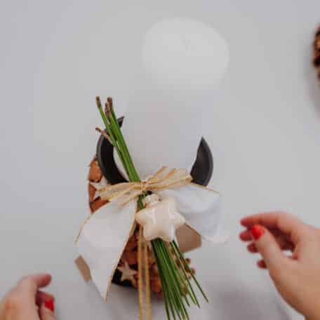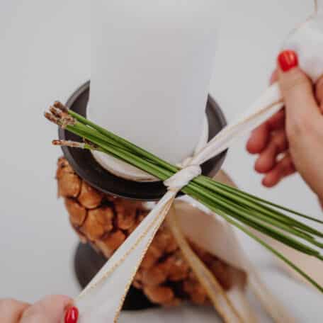 Mache mit den losen Enden des Bandes, das um die Kerze gebunden ist, einen lockeren Knoten und lege die Föhrennadeln hinein.