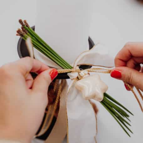 Stelle die Kerze auf den Ständer, schneide ein weiteres Stück Band ab und binde dieses unten um die Kerze herum. Lasse die Bandenden stehen.