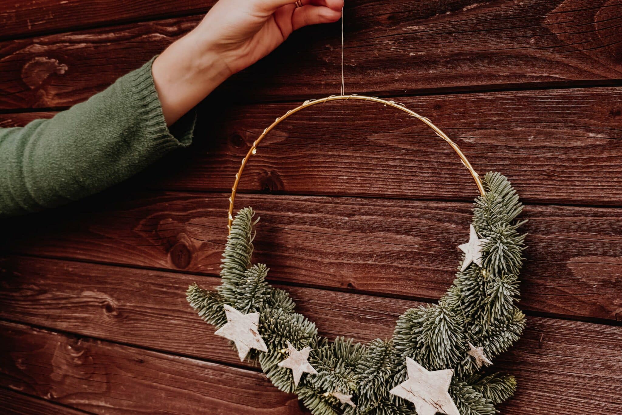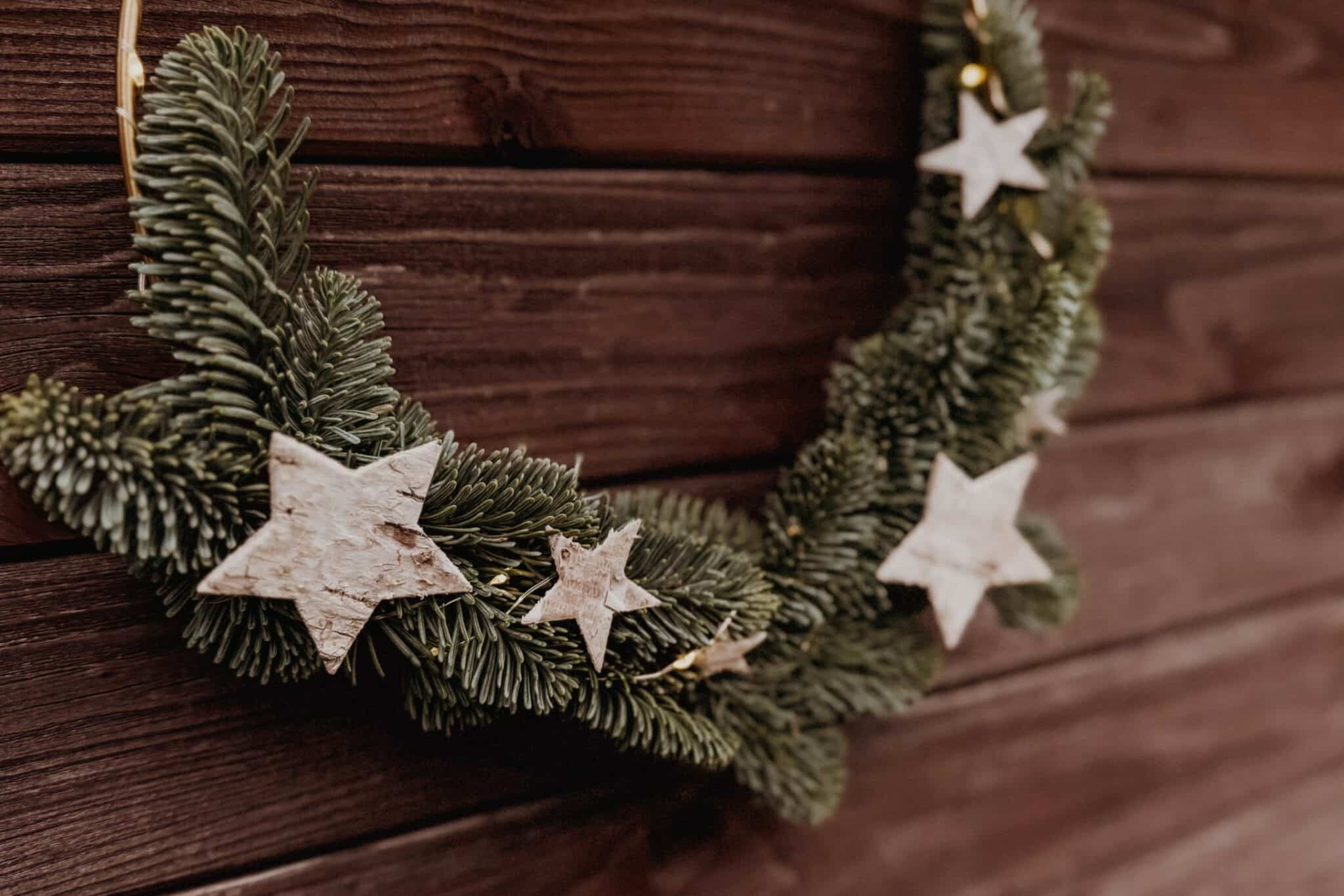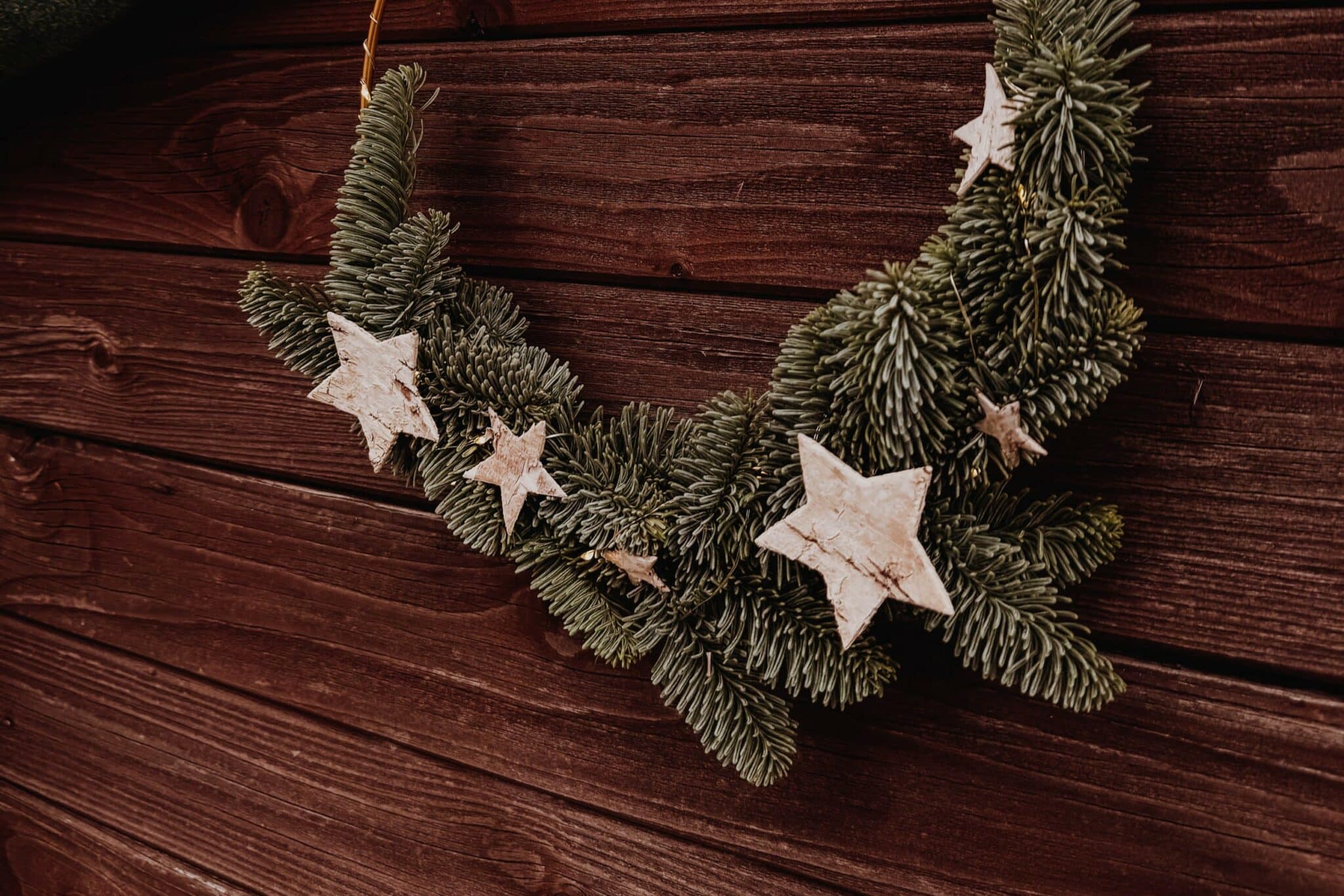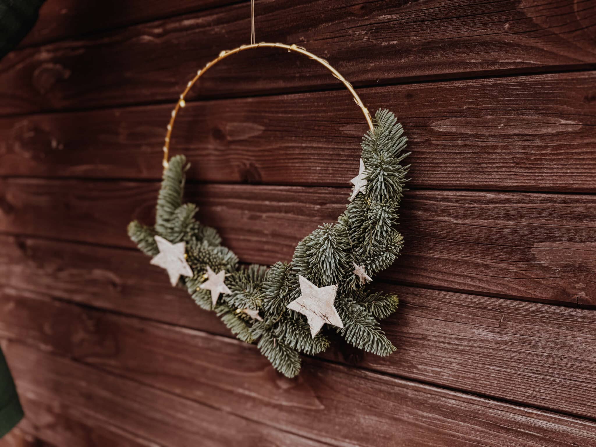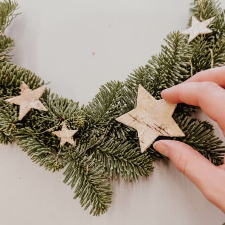 Sterne mit Heissleim auf den Koniferen befestigen. Als Aufhängevorrichtung: Draht zuoberst in Form einer Schlaufe anbringen.