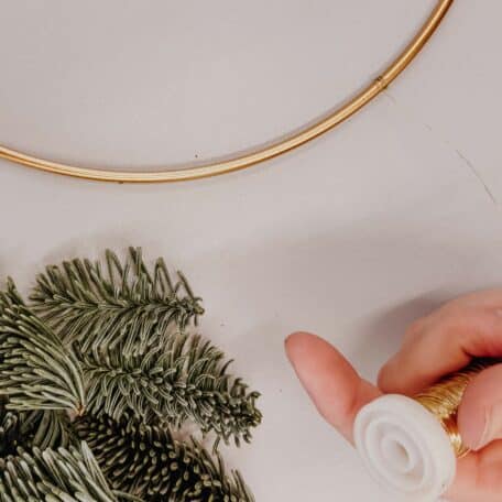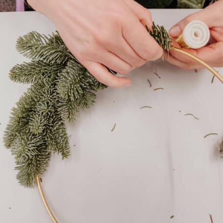 Stielenden mit Draht am Ring befestigen. Draht nicht abschneiden, sondern damit weitere Zweige – jeweils etwas versetzt – an den Loop binden, bis die gewünschte Fülle erreicht ist.
