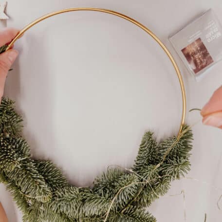 Lichterkette um den ganzen Loop wickeln. Darauf achten, Batteriegehäuse hinter den Koniferen zu verstecken.
