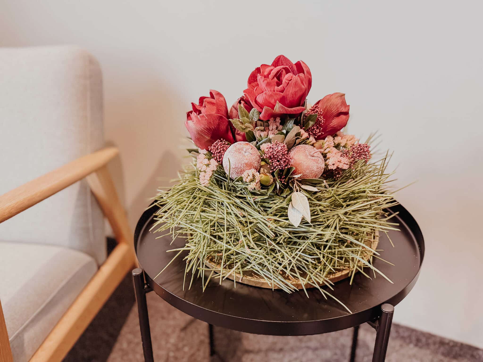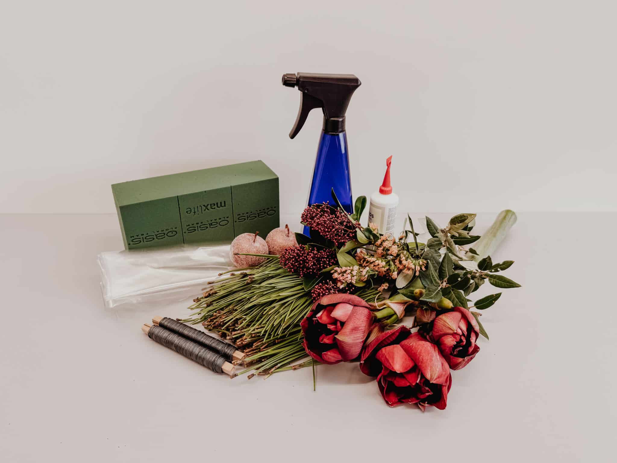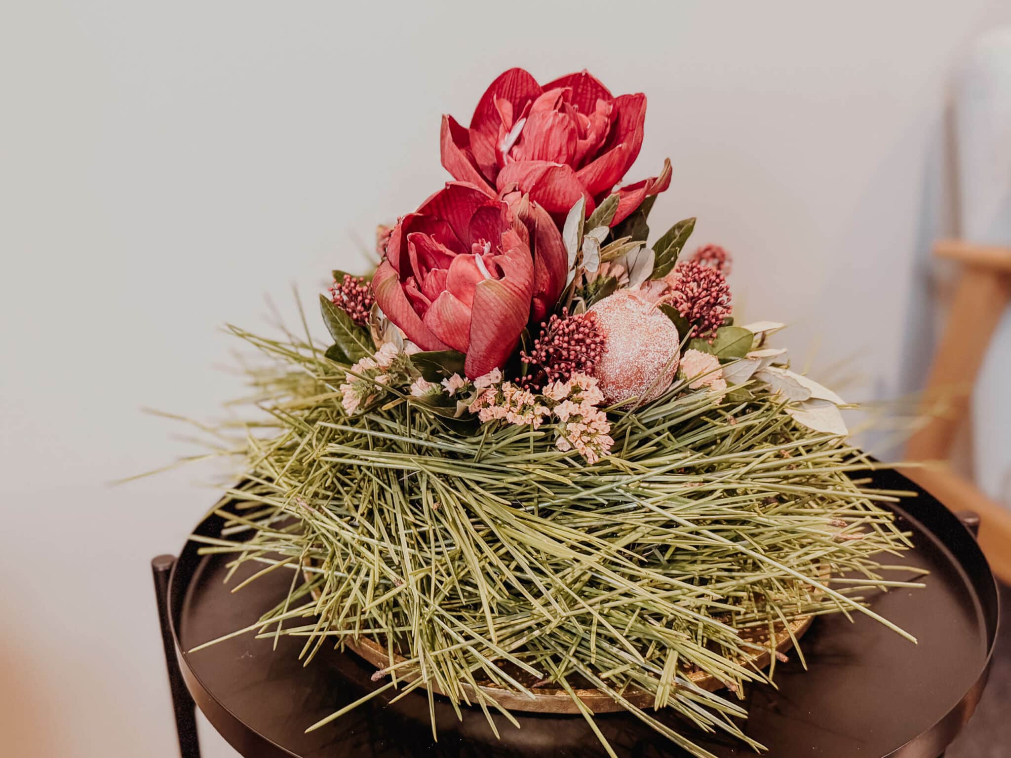 - Blüten von Amaryllis, Skimmia und weitere Blumen sowie Grün