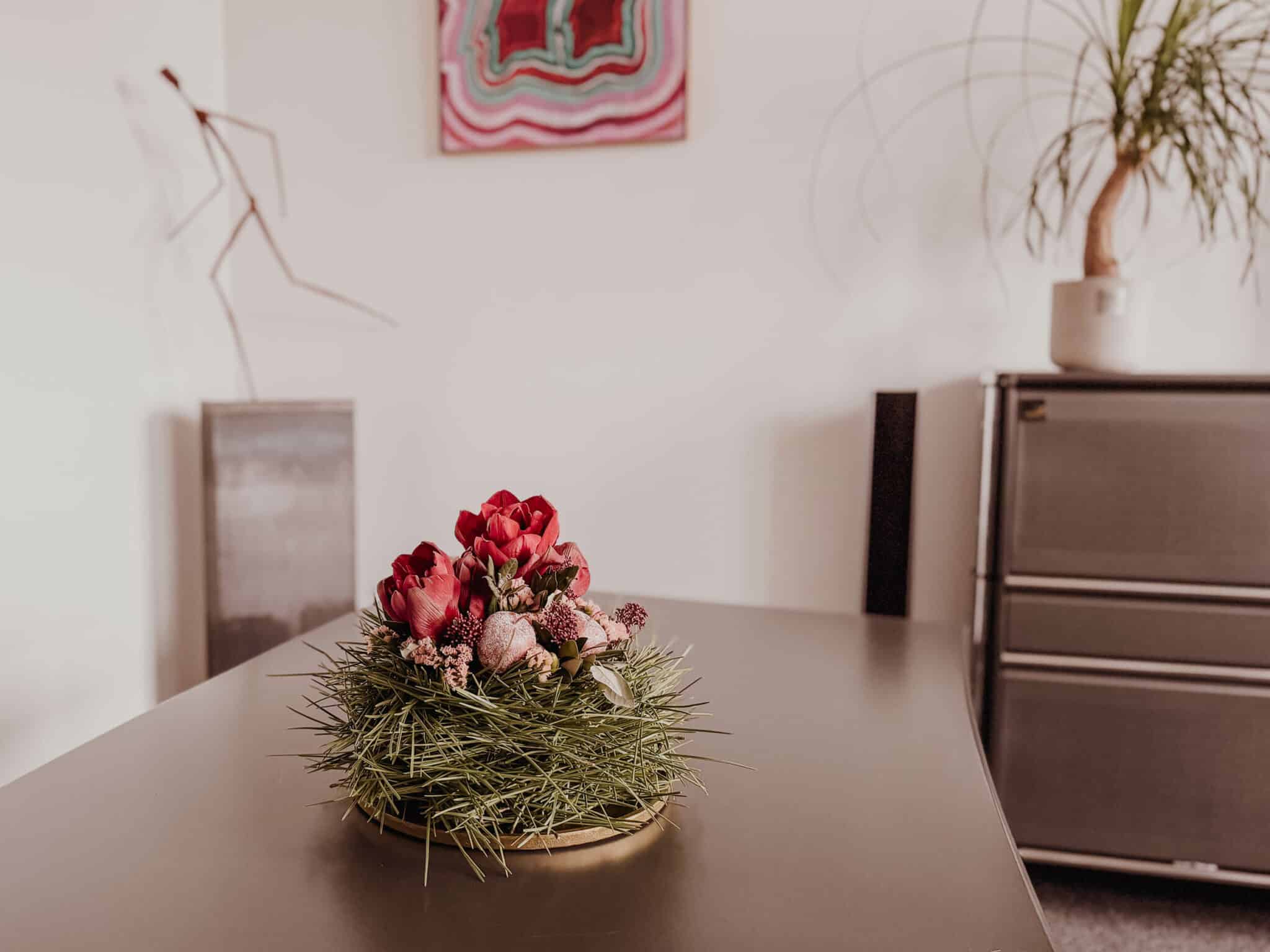 Blumen benötigen Wasser. Deshalb muss das Oasis etwas gewässert werden, sobald es sich relativ trocken anfühlt. Stelle einen passenden Teller darunter, damit die Möbel keine Wasserflecke bekommen.