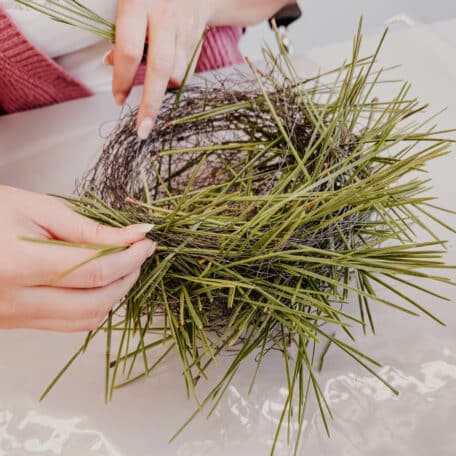 In einer Sprühflasche Wasser mit wenig weissem Leim mischen. Föhrennadeln mit Weissleim-Mischung besprühen und weitere Nadeln reinstecken, bis man Draht nicht mehr sieht. Die weiteren Nadeln zwischendurch immer wieder mit Weissleim besprühen. Das Ganze am besten eine Stunde trocknen lassen.