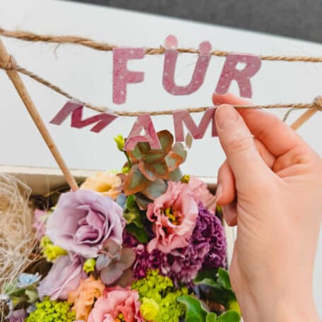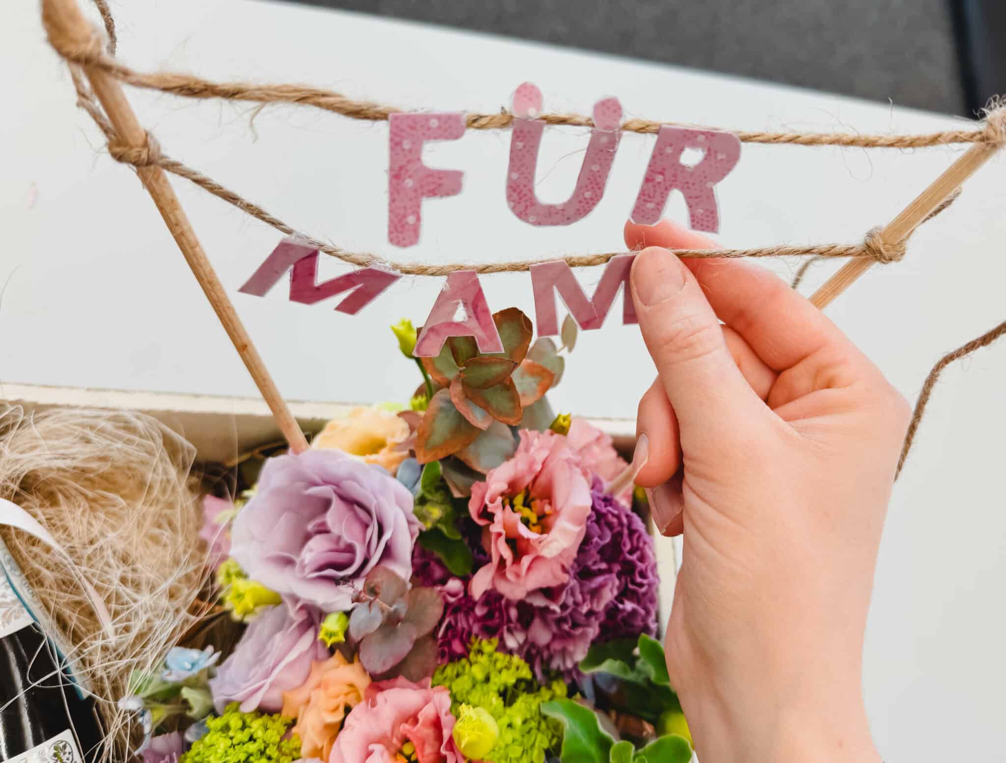 Dessine les lettres (POUR MAMAN) sur du papier, découpe-les, puis colle-les sur la ficelle avec de la colle chaude.