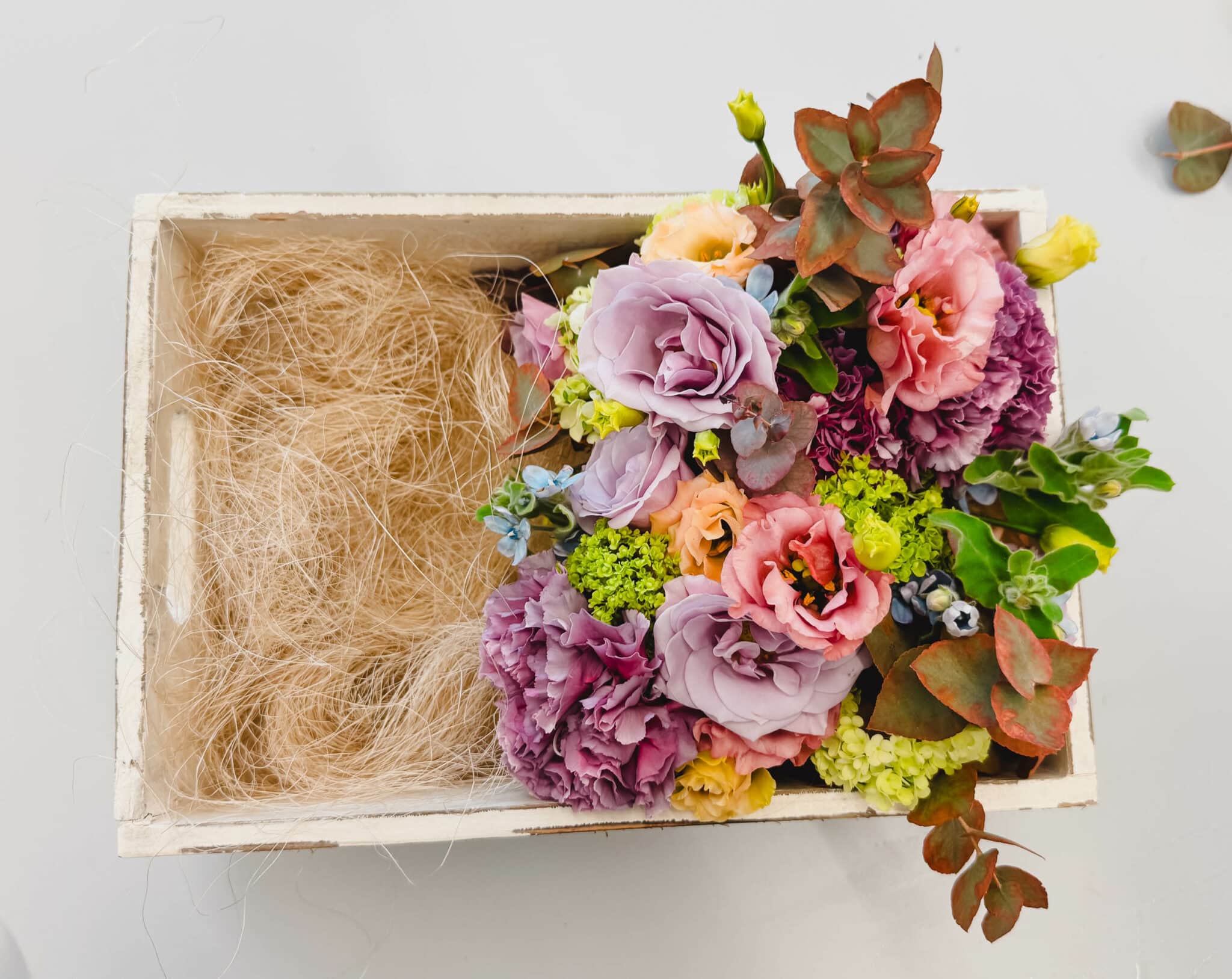 Place l'arrangement terminé dans la petite boîte en bois et rembourre le côté gauche avec du sisal.