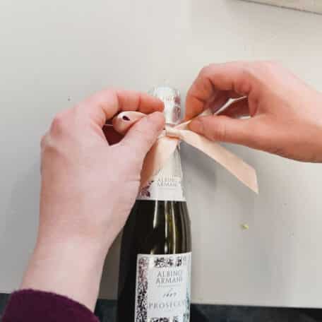 Avec un morceau de ruban, fais un joli nœud autour du prosecco et pose-le sur le sisal.