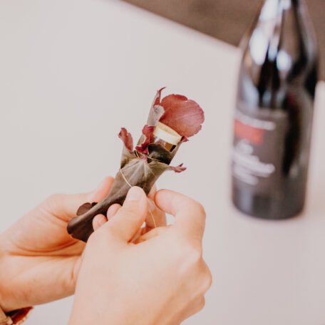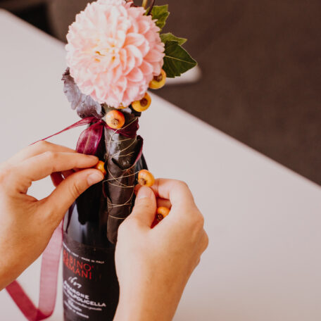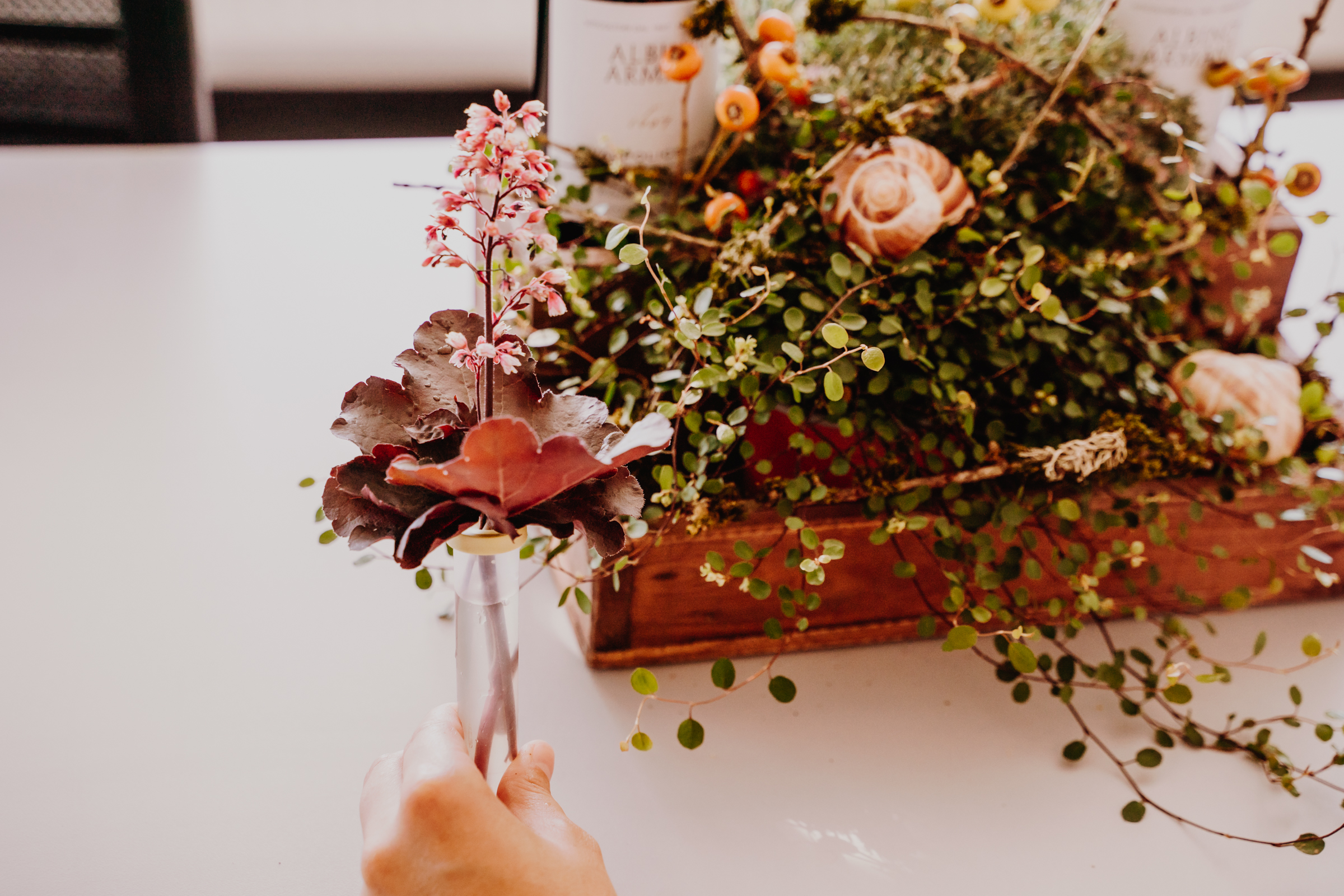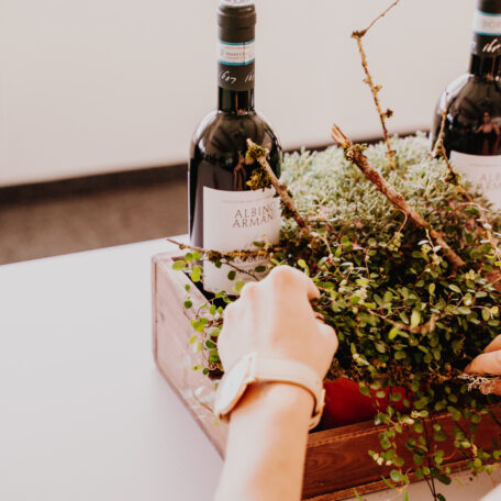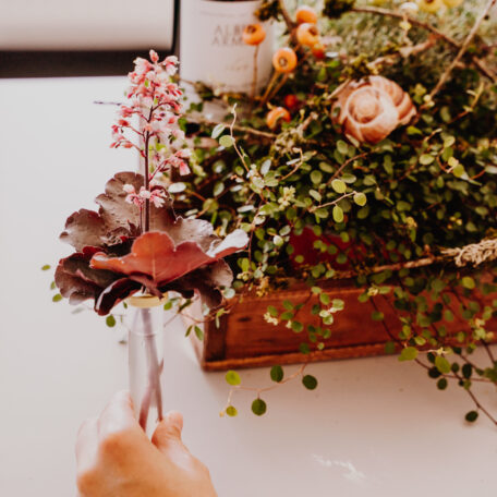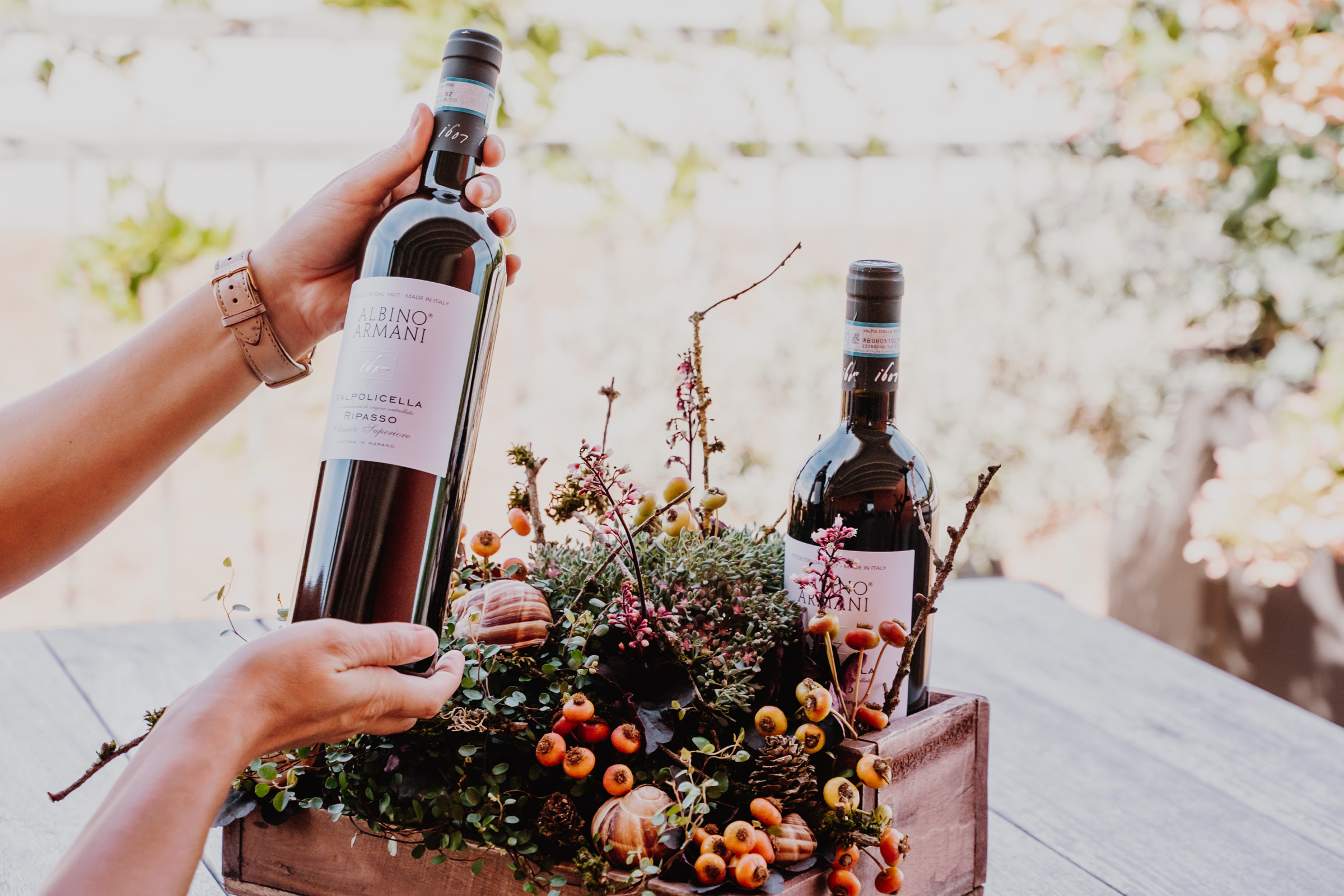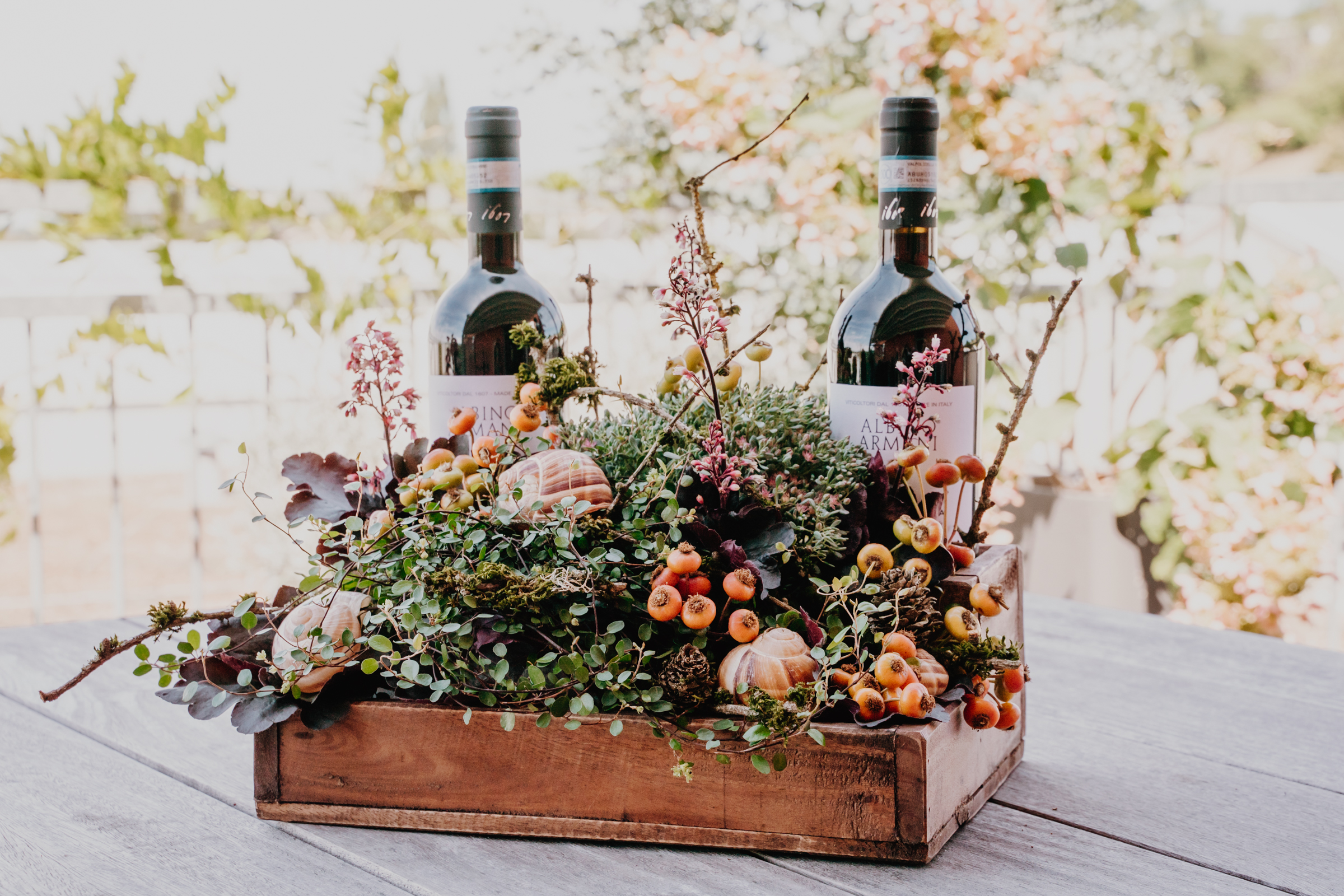 Mettre les bouteilles de vin dans la caisse et placer les plantes (les arroser légèrement avant).