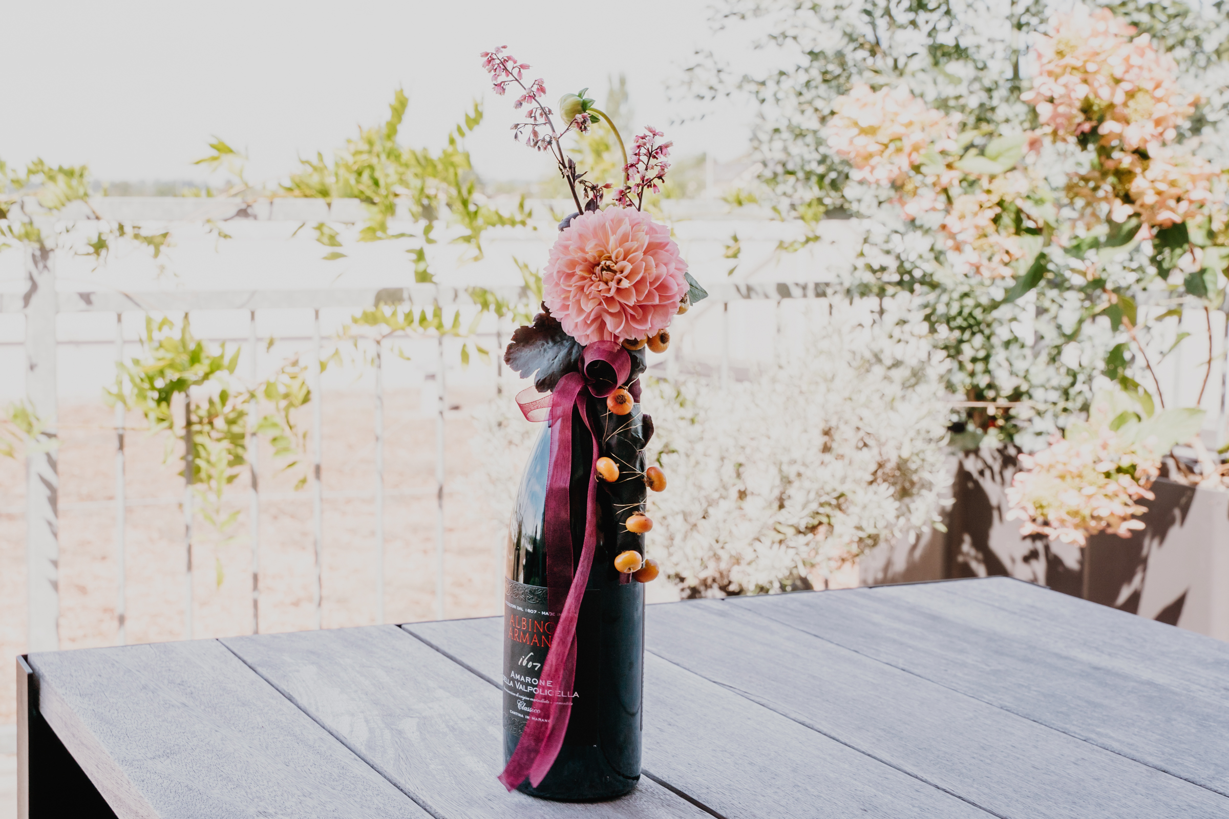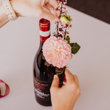 Remplir les tubes avec du dahlia et d'autres feuilles d'heuchère et les attacher à la bouteille avec du ruban.