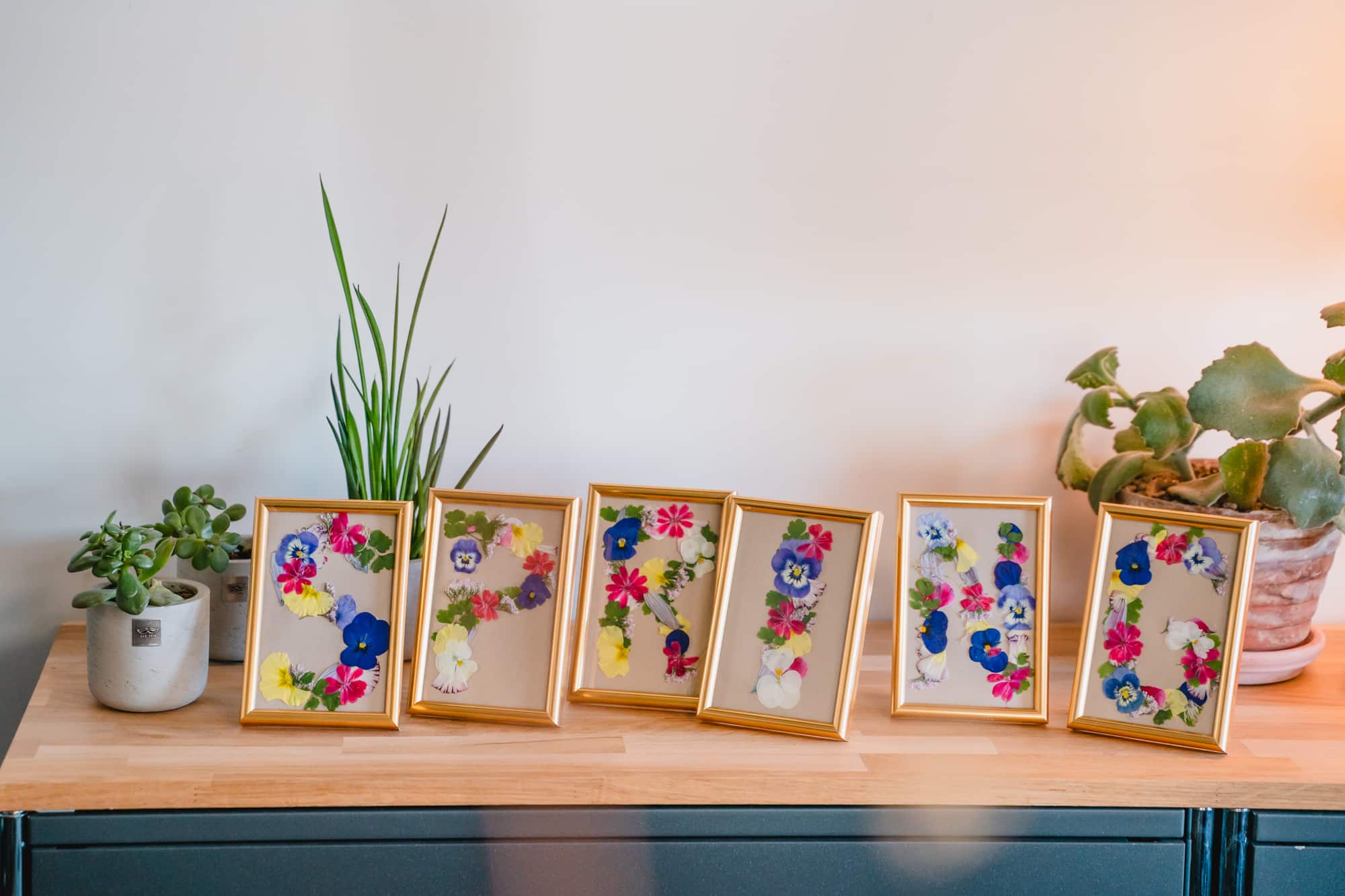 Former ensuite la lettre souhaitée avec des fleurs et des feuilles (S P R I N G).