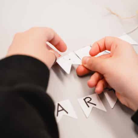 Découpe des petits drapeaux dans le papier et écris dessus "JARDIN DE BIENS" (1 lettre par drapeau).