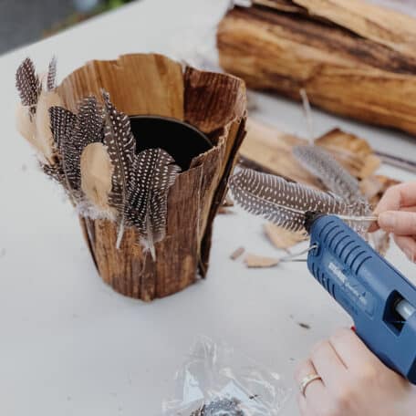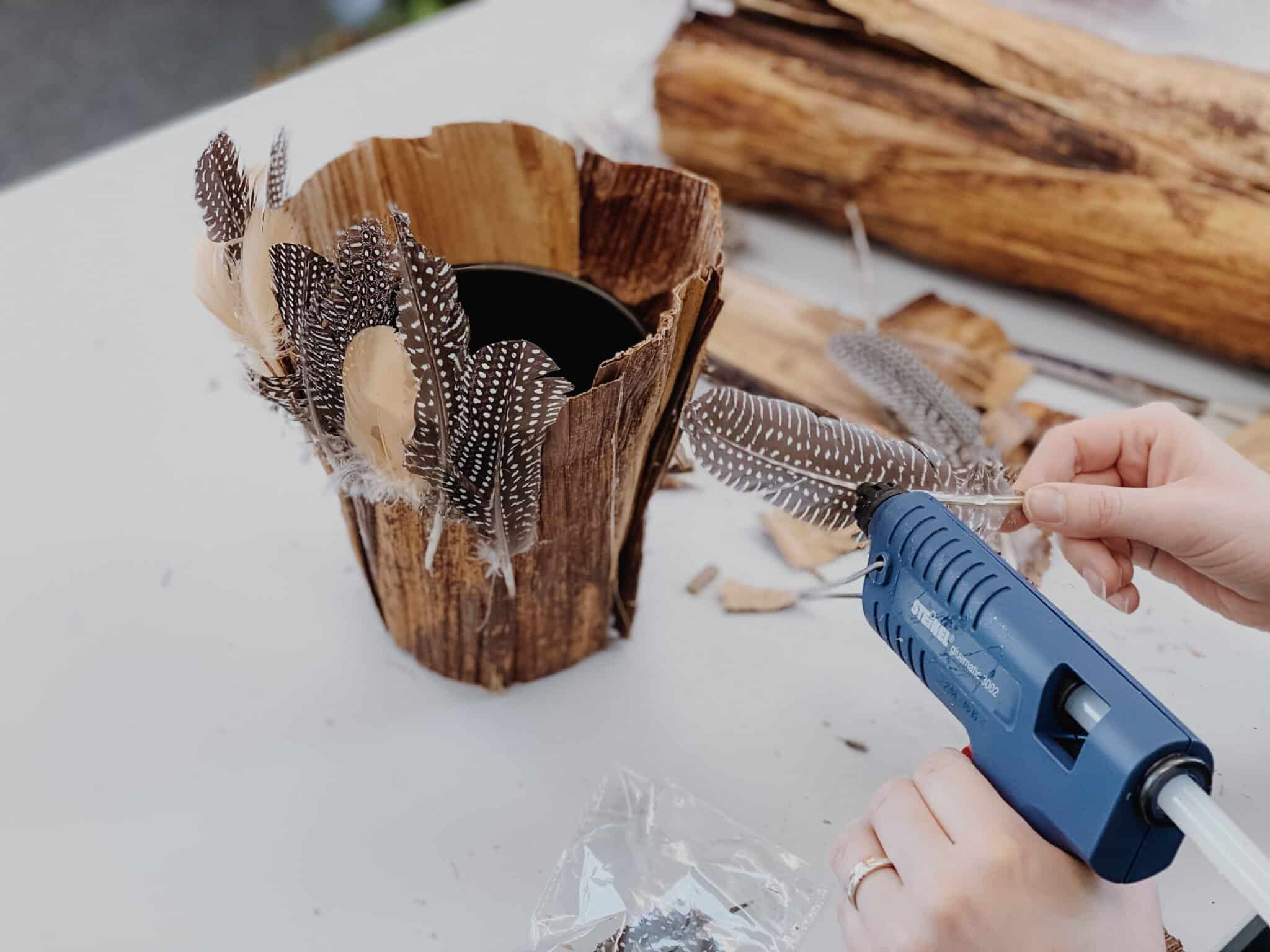 Colle l'écorce de coco sur le récipient avec de la colle chaude et fixe les plumes sur l'écorce également avec de la colle chaude.