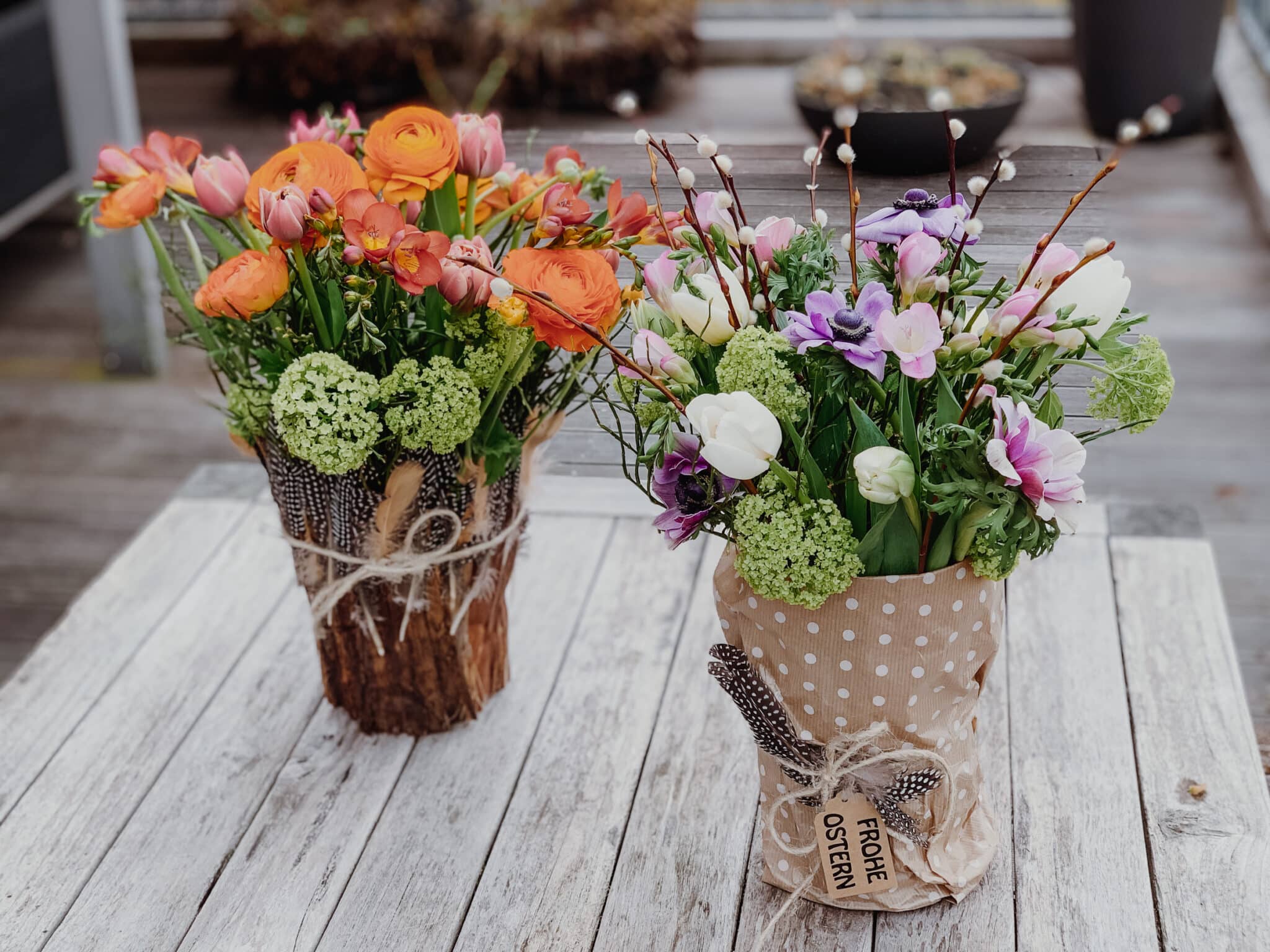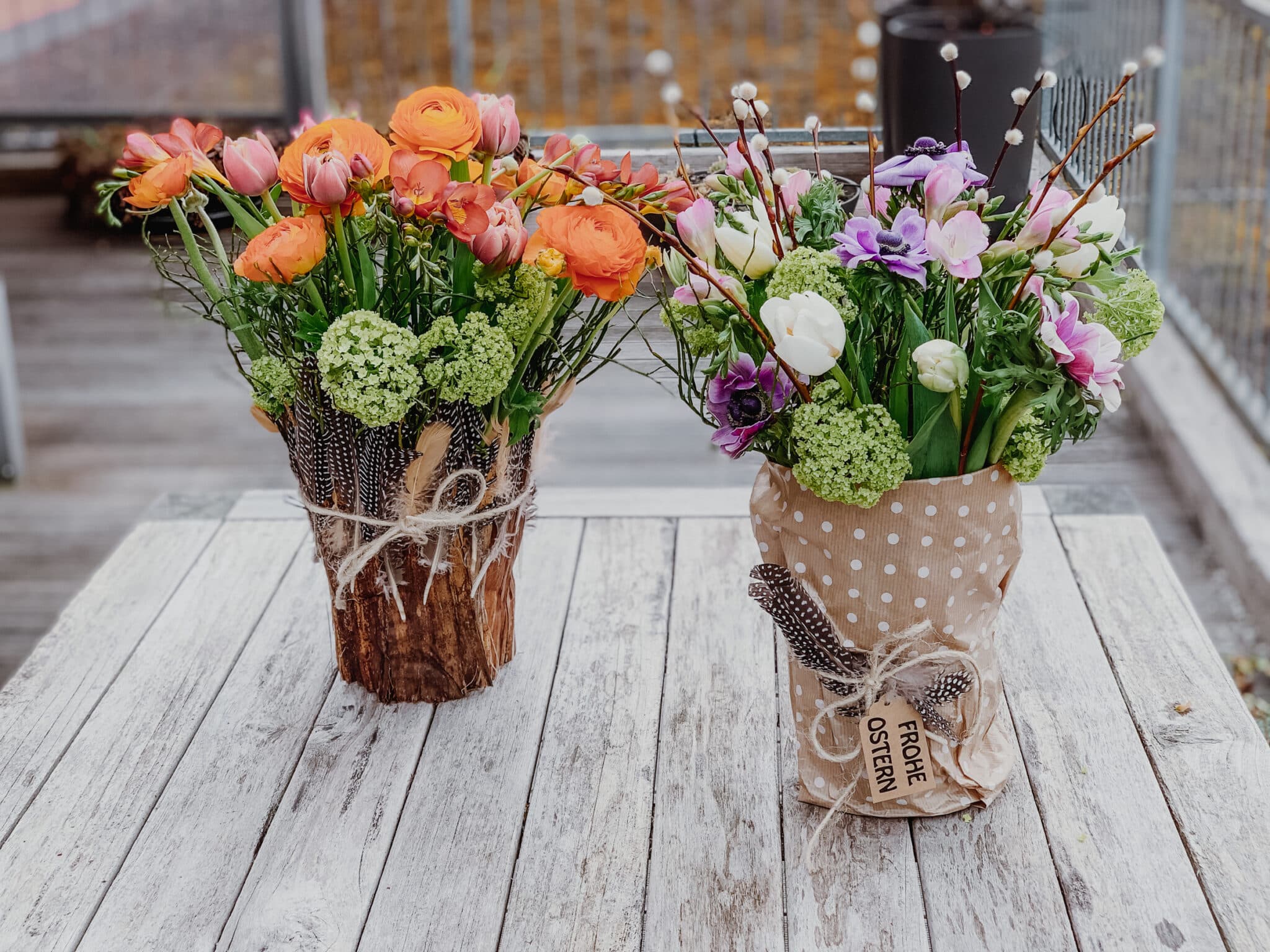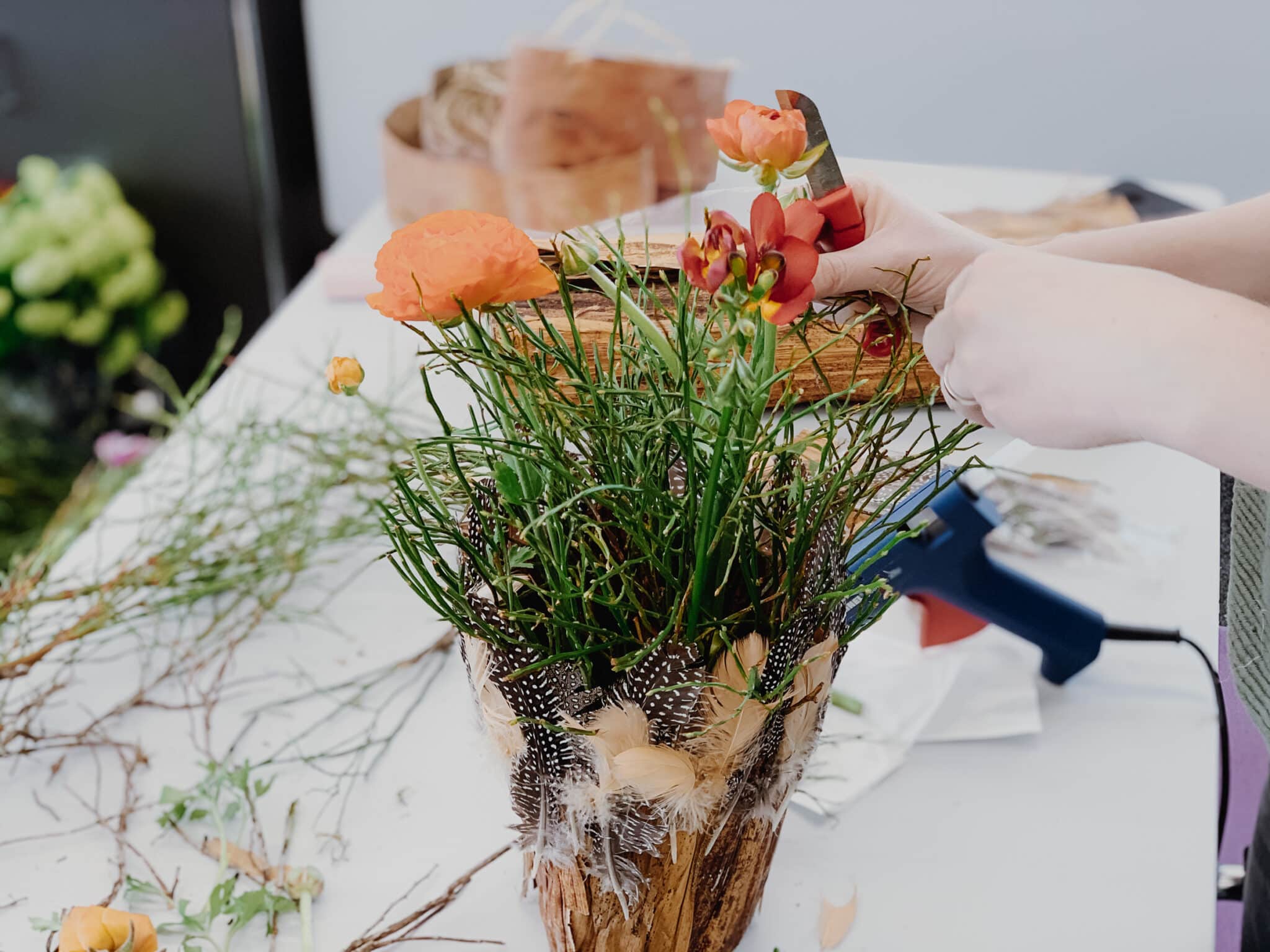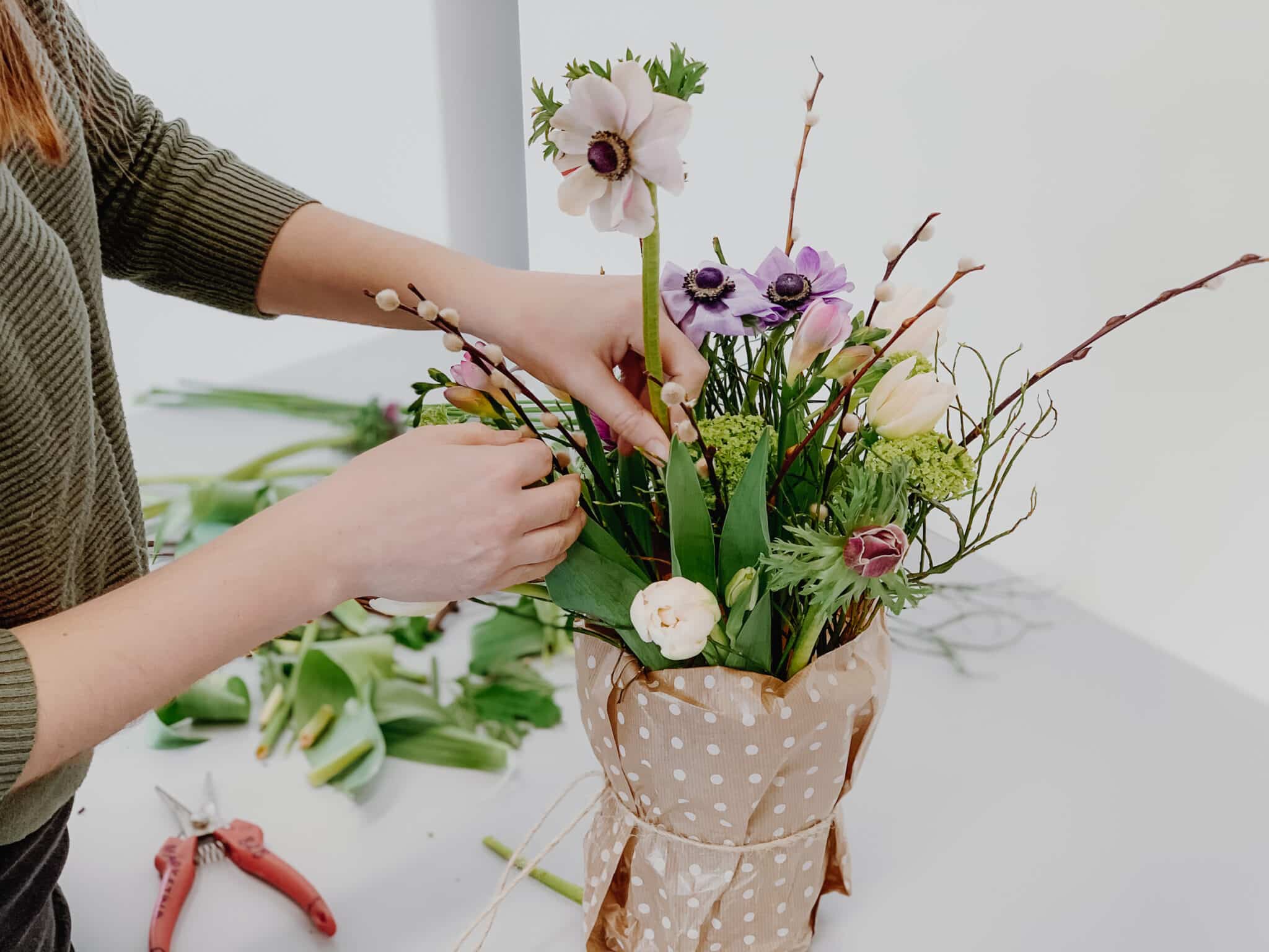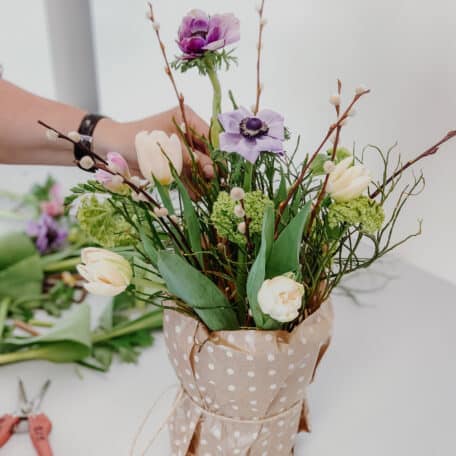 Remplis le vase d'eau et place les fleurs. Commence par la myrtille et intercale simplement les autres fleurs.