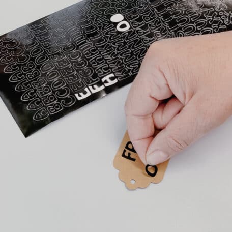 Inscris un joli message (Joyeuses Pâques, Happy Easter) sur l'étiquette cadeau via des lettres autocollantes et attache-la à l'autre ficelle avec de la ficelle.