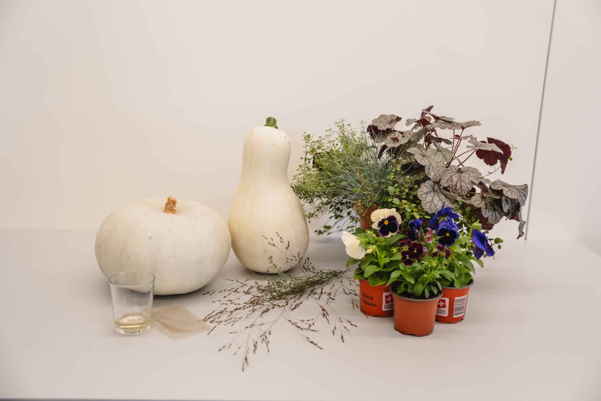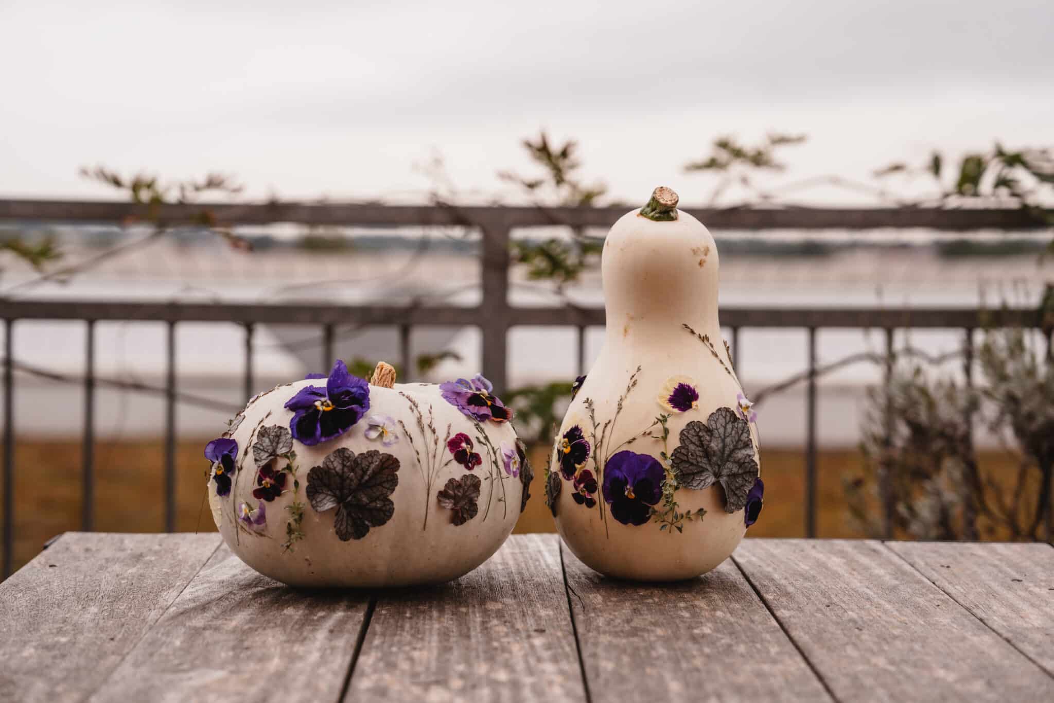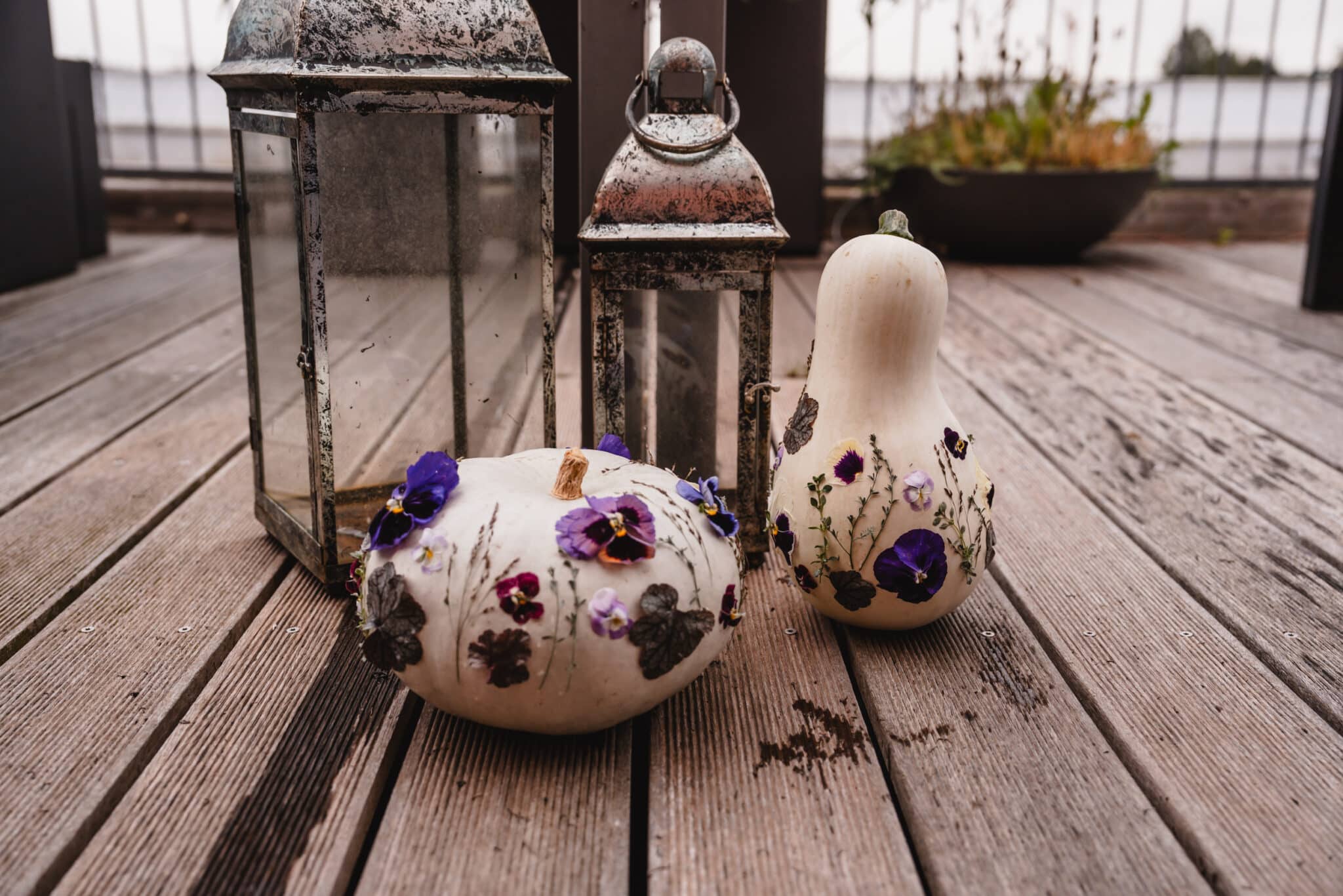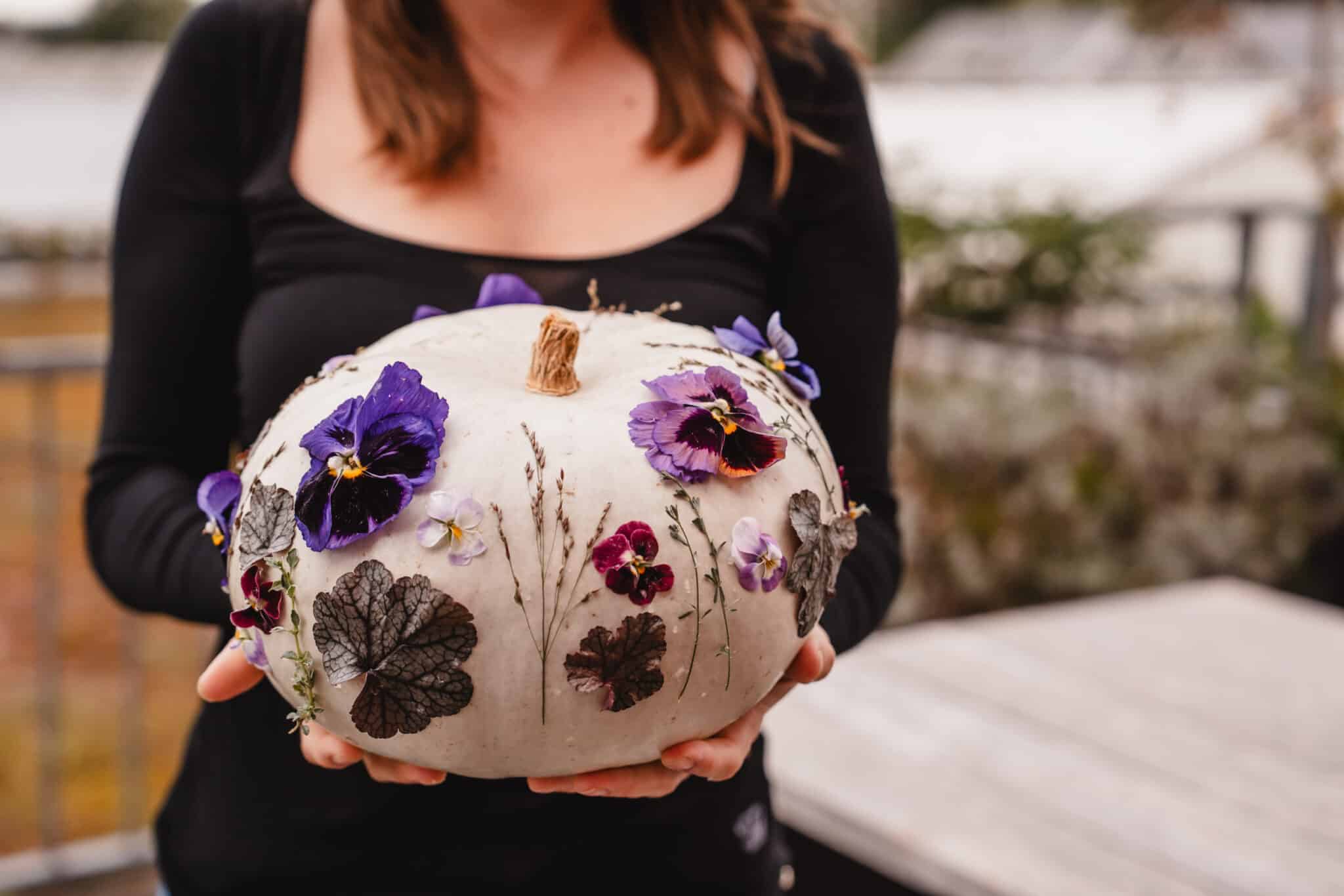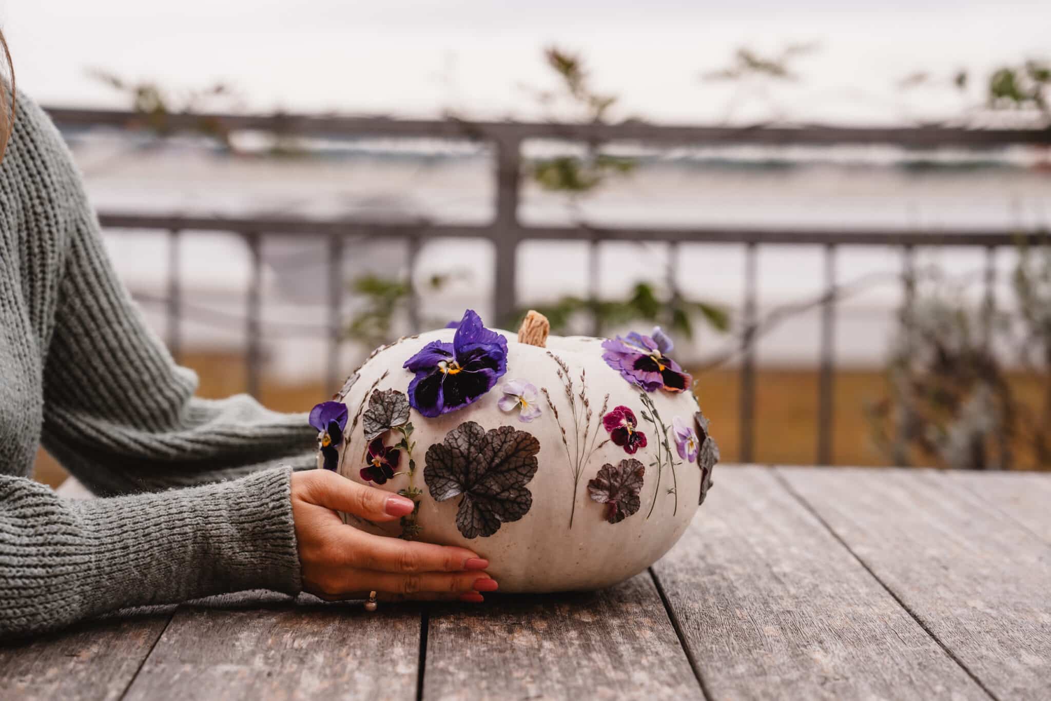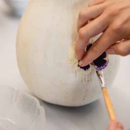 Badigeonne la citrouille avec cette colle et colle des herbes, des fleurs et des feuilles dessus.