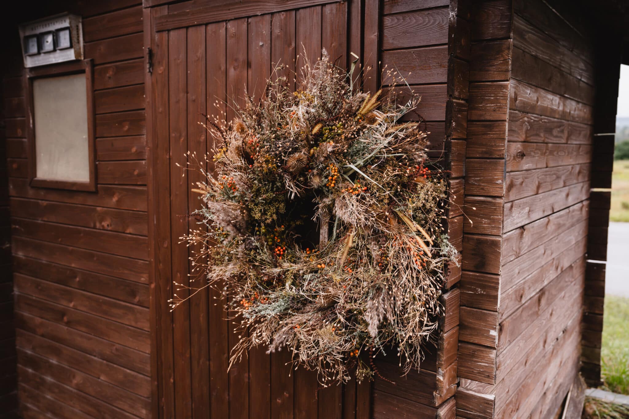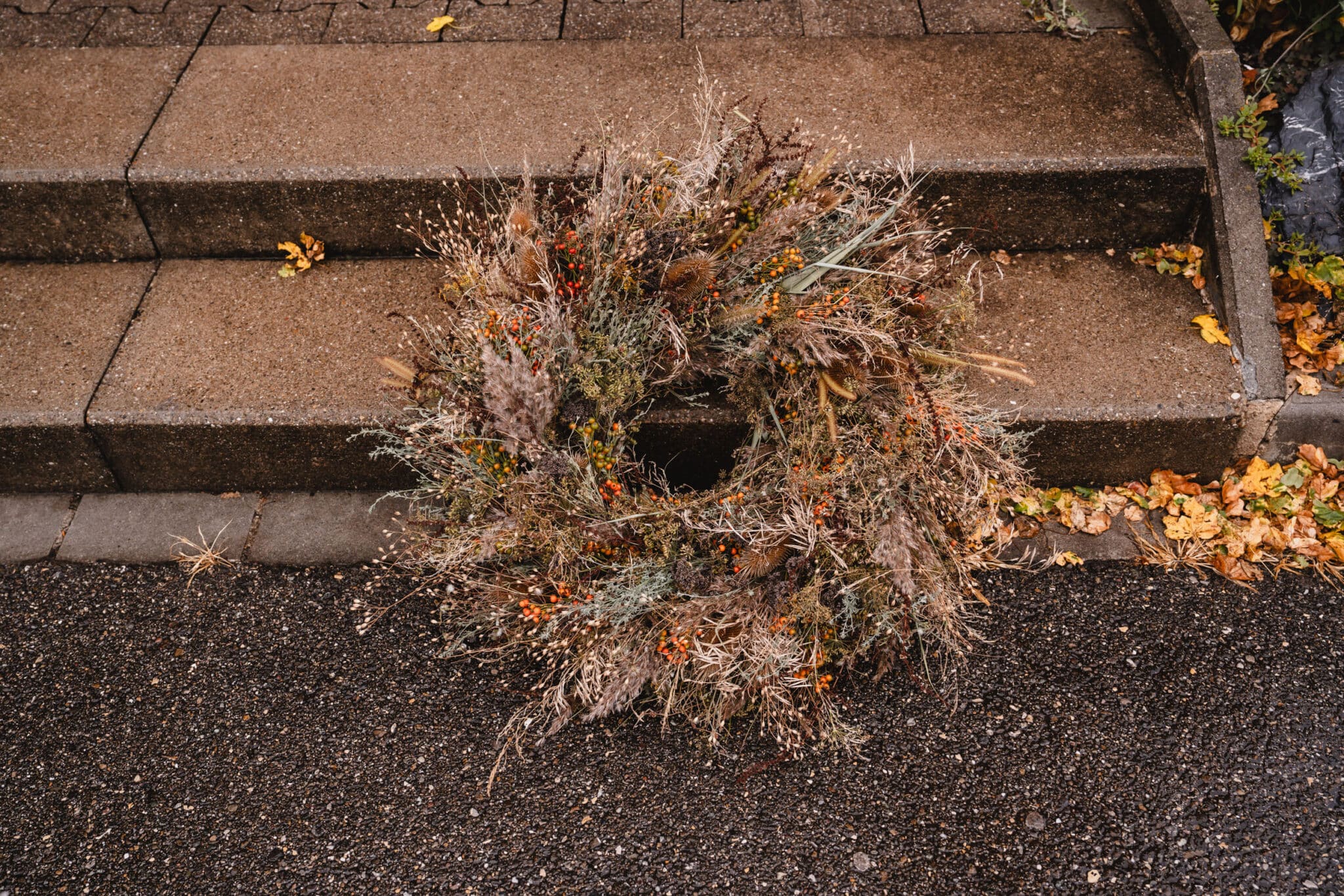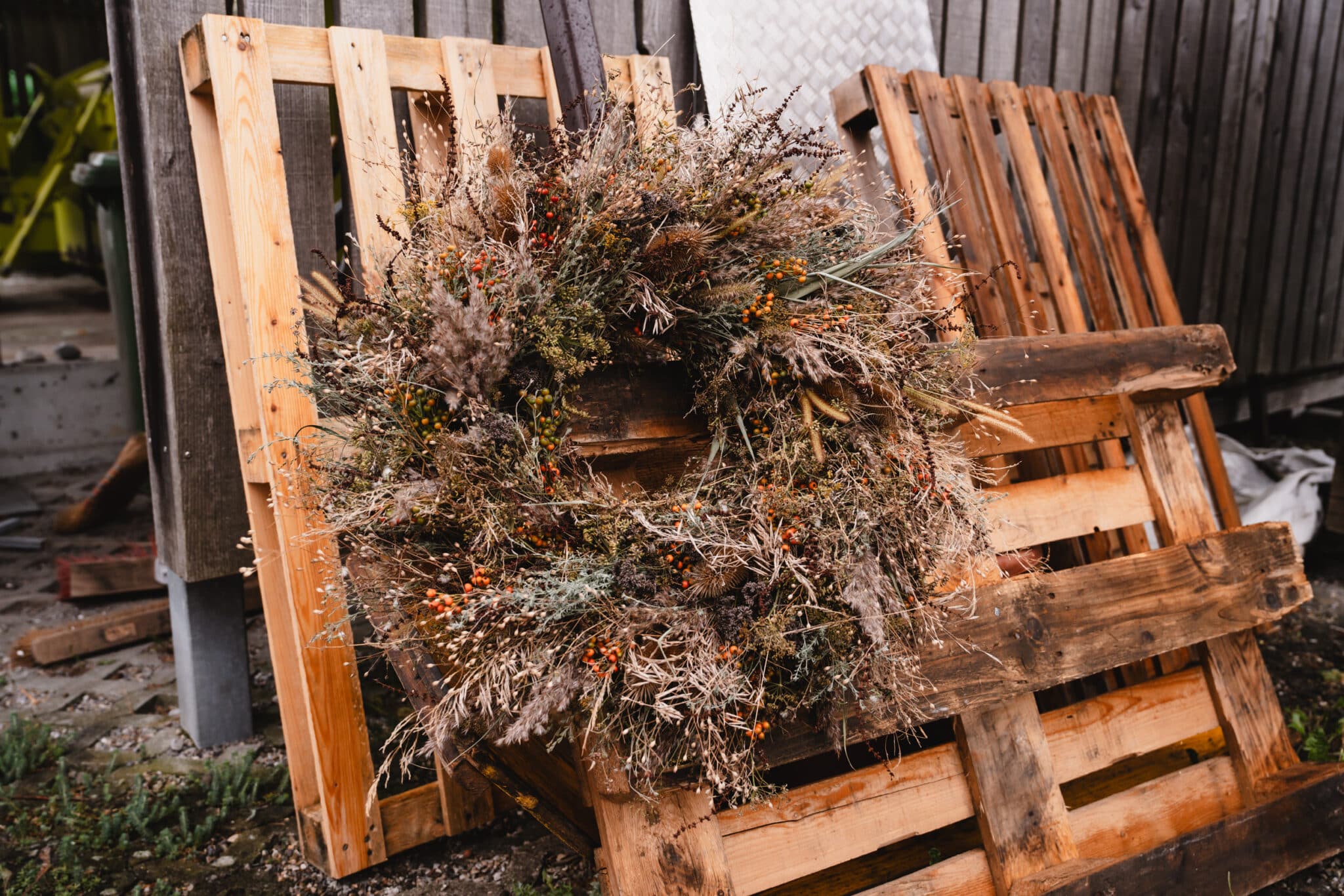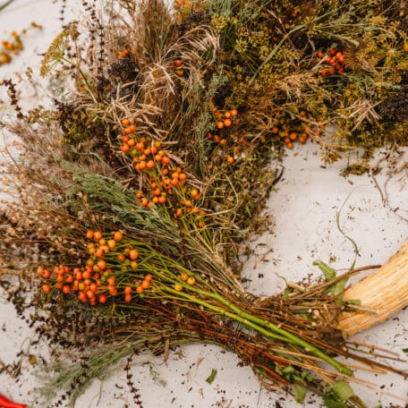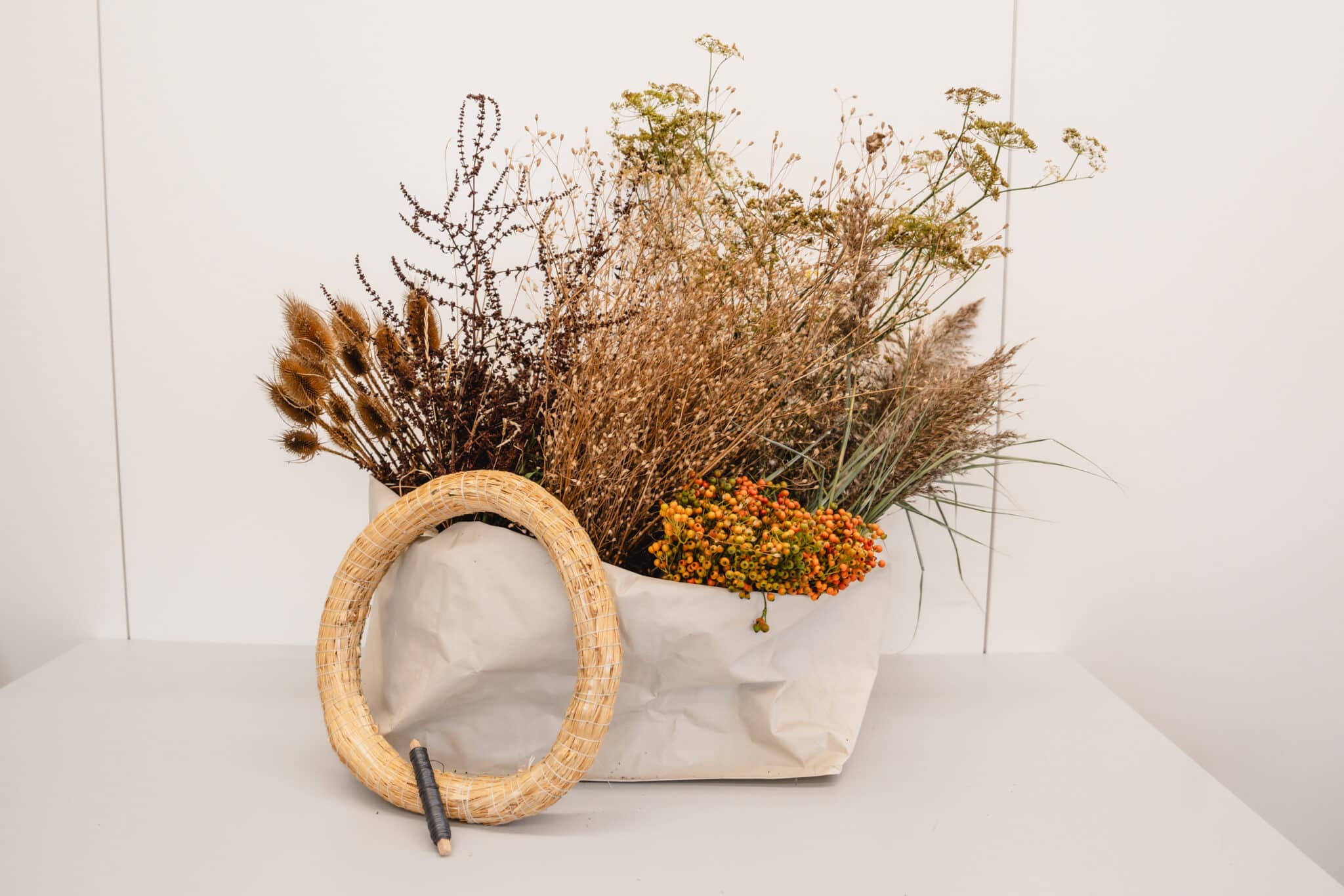 Garnir toute la couronne de cette manière. Travaille bien serré et serre bien le fil de fer, car les tiges perdent ensuite un peu de volume en séchant.